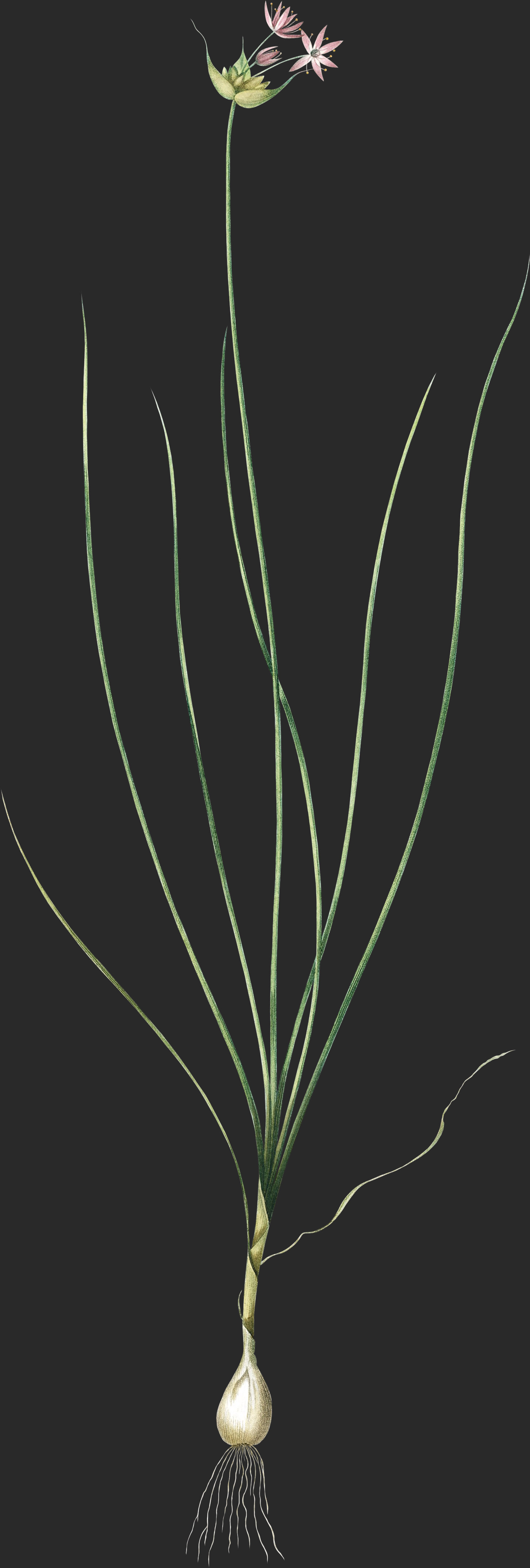 Une bulbe ovoïde, blanche, grosse comme une noisette et couverte d’une tunique écailleuse, dont les nervures saillantes forment un réseau par leur entrecroisement, émet par sa base quelques fibres simples et noirätres. De son sommet nait un faisceau de feuilles longues de deux à trois décimètres, à peine larges de trois a quatre millimètres, planes, courbées en gouttière à la base, roulées en forme de soies vers le haut. Au milieu de ces feuilles s’élève une hampe gréle, cylindrique, plus longue que les feuilles. Lombelle qui la termine est lache, composée d’un nombre de fleurs très-variable, entre lesquelles so trouvent de petites bulbes. Celles-ci, qui sont d’autant moins nombreuses que les fleurs le sont davantage, et qui manquent même quelquefois entièrement, sont sessiles, blanches, ovales, pointues. Les fleurs sont rouges, petites, portées sur des pédicelles grèles, droits, égaux, longs de deux centimètres environ. La spathe qui les entoure est composée de trois valves membraneuses, ovales, rétrécies en pointe, égales entre elles, et atteignant à peine la longueur des pédicelles.