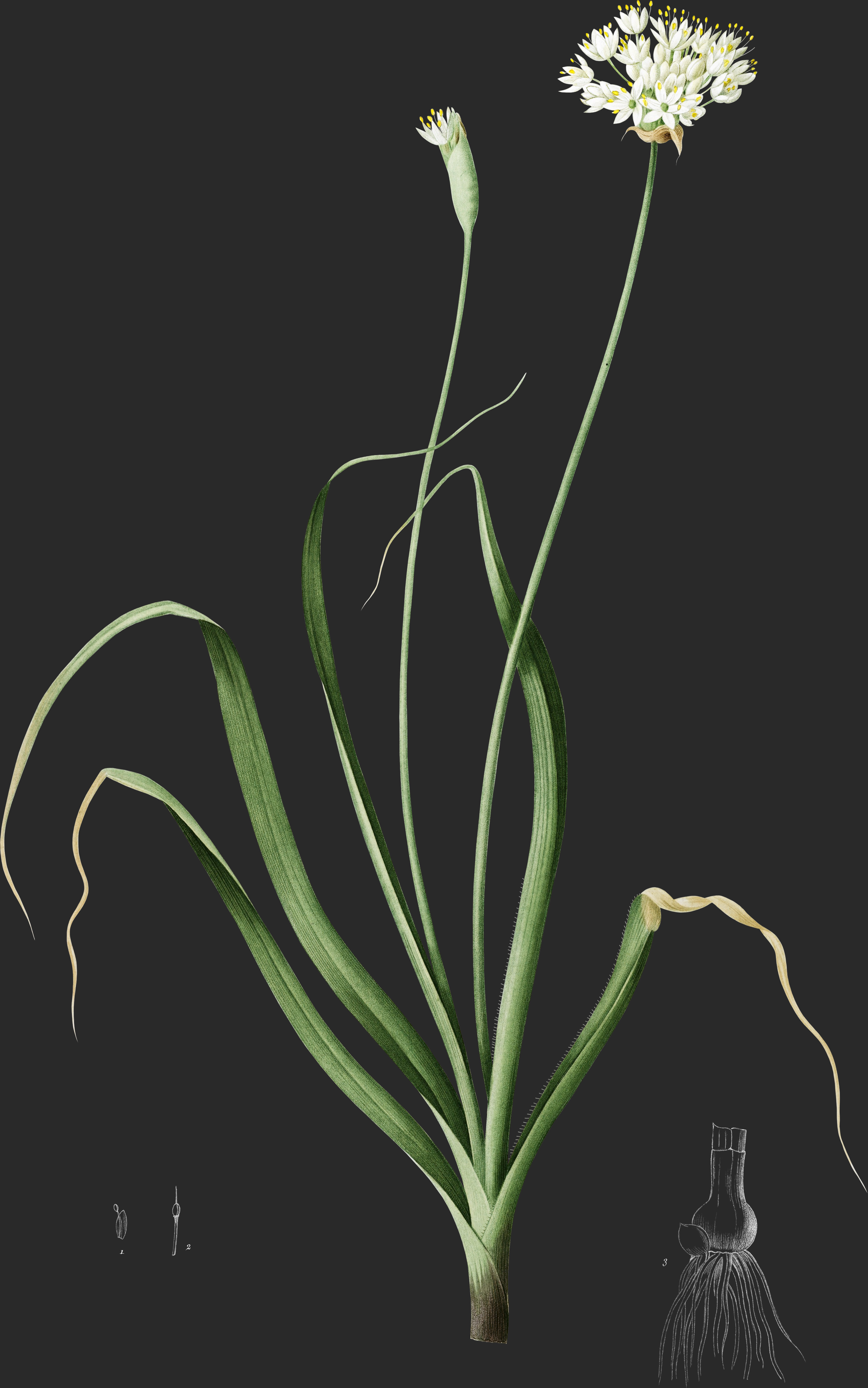 Une bulbe arrondie, blanchâtre, de la grosseur d’une cerise, donne naissance à des feuilles molles, linéaires, larges de quinze millimètres environ, pliées en gouttière, relevées en carène sur le dos, aigués, entières, ciliées sur les bords, surtont dans le bas, quelquefois aussi longues que la hampe, d’autrefois plus courtes. Dans la variété A, ces feuilles sont glauques et velues sur le dos, dans une grande partie de leur longueur. Dans la variété B, elles sont vertes, glabres sur le dos, et simplement ciliées.