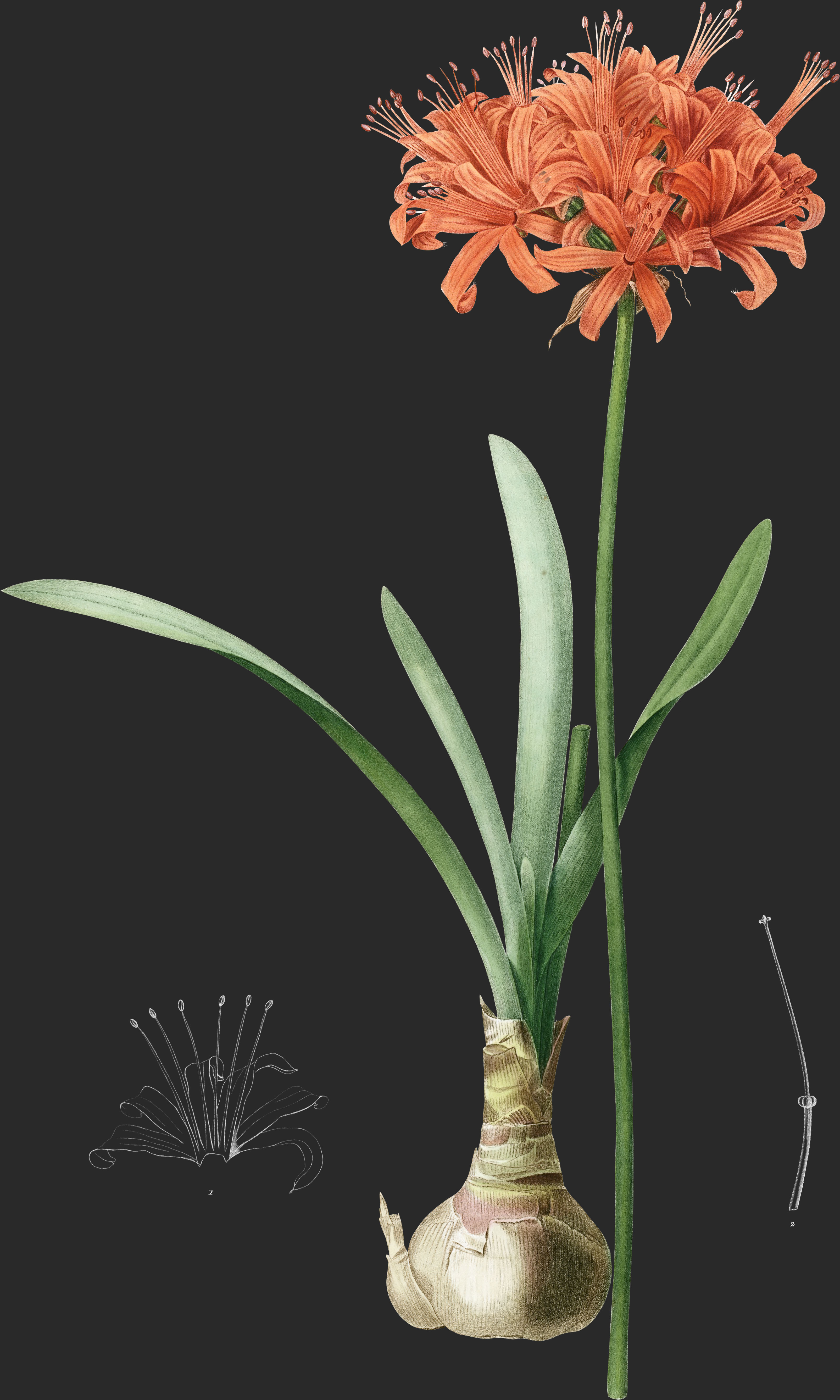 La bulbe qui lui donne naissance est arrondie, un peu déprimée, grosse comme une petite pomme, et couverte d’écailles membraneuses, rougeâtres. De son sommet nait un faisceau de sis ou huit feuilles lancéolées-linéaires, plus ou moins courbées en forme de faux sur leurs bords, disposées en gouttière dans leur partie inférieure, planes et étalées dans la supérieure, arrondies au sommet, glabres et d’une couleur glauque. Elles se développent en même temps que les fleurs, et continuent à croitre jusqu’à leur entier épanouissement, mais restent cependant toujours plus courtes que la hampe: celle-ei sort à côté d’elles du sommet de la bulbe et s’élève jusqu’à la hauteur de cinq ou six décimètres. Entourée à sa base par quelques gaines écailleuses, courtes et irrégulières, qui enveloppent également la base des feuilles, elle est nue dans tout le reste de sa longueur. Elle est droite, glabre, un peu glauque, comprimée dans le bas, presque cylindrique dans le haut. Les fleurs, au nombre de quinze environ, forment à son sommet une ombelle assez serrée; elles sont d’une magnifique couleur écarlate et portées sur des pédicelles assez forts, qui atteiguent la longueur de trois ou quatre centimètres. A la base de l’ombelle est une spathe à deux valves, ovales-lancéolées, aigués, d’une couleur rougeâtre et à peu près de la longueur des pédicelles. Ceux-ci sont séparés par des bractées semblables aux valves de la spathe, mais plus étroites.