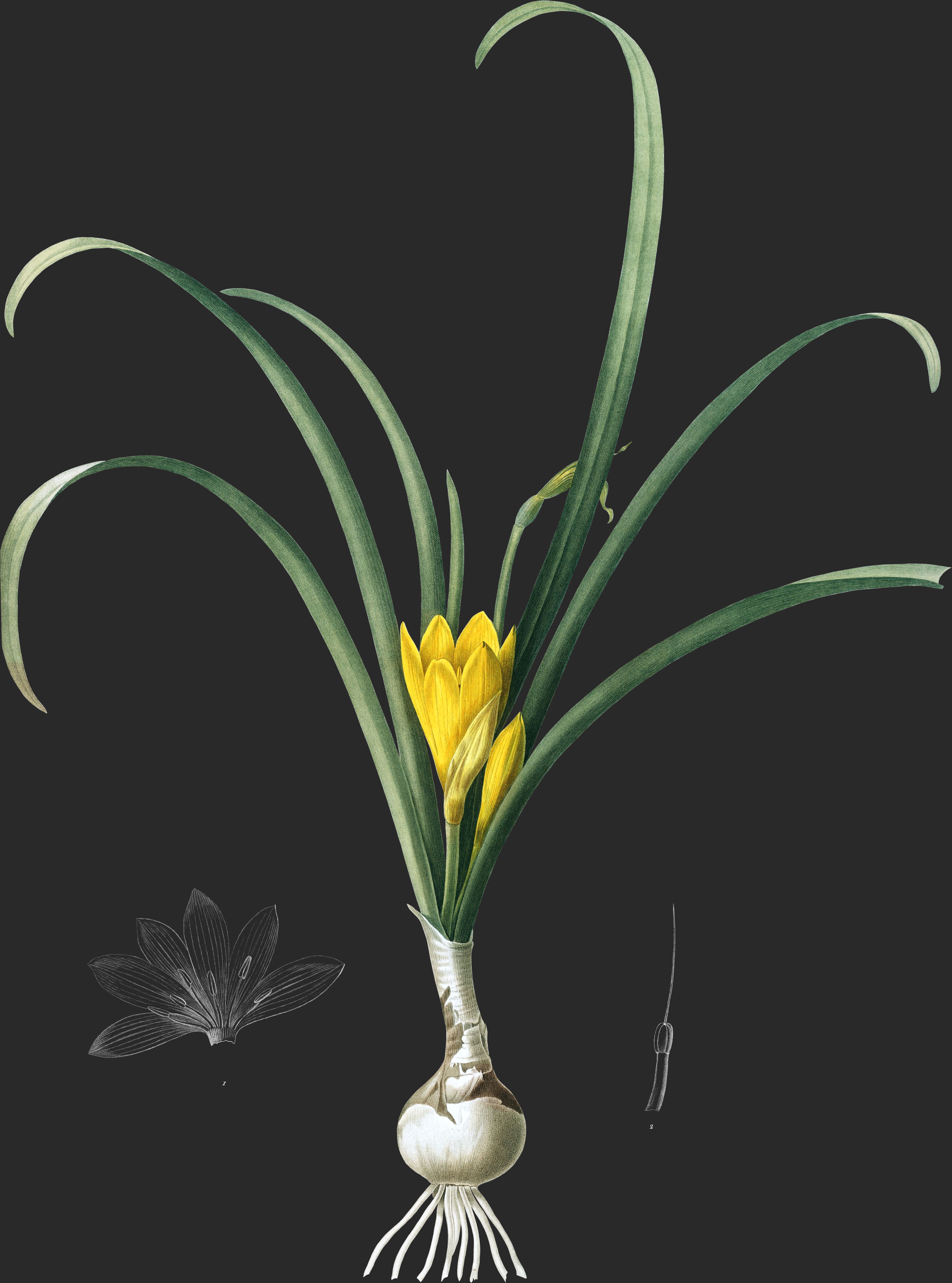 Cette plante a quelque ressemblance, par son port et la conformation de sa fleur, avee les Colchiques et les Safrans. Sa racine est une bulbe arrondie, assex grosse, revêtue de tuniques brunes; elle émet une gaine cylindrique et tronquée, de laquelle sortent sept à huit feuilles glabres, d’un vert foncé, planes, alongées, obtuses, larges de 8–10 millimètres, et disposées sur deux rangs opposés; à côté des feuilles et de la même gaine sort une ou rarement deux hampes plus courtes que les feuilles.