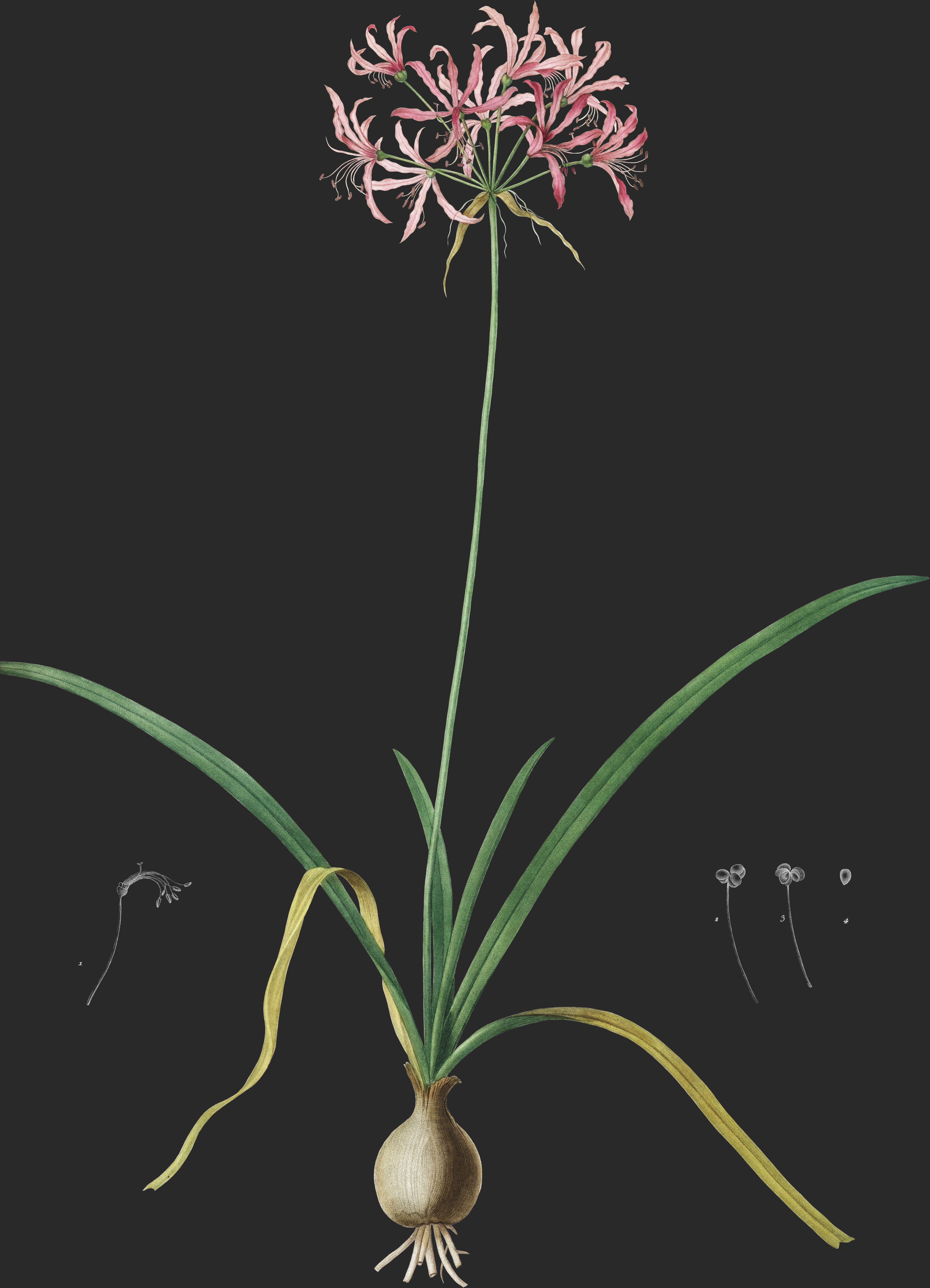 Cette élégante Amaryllis se distingue de toutes les espèces du même genre, üses fleurs roses ou purpurines, plus petites que dans tontes les autres espèces, et dont les lobes sont étroits et cropus sur les bords.