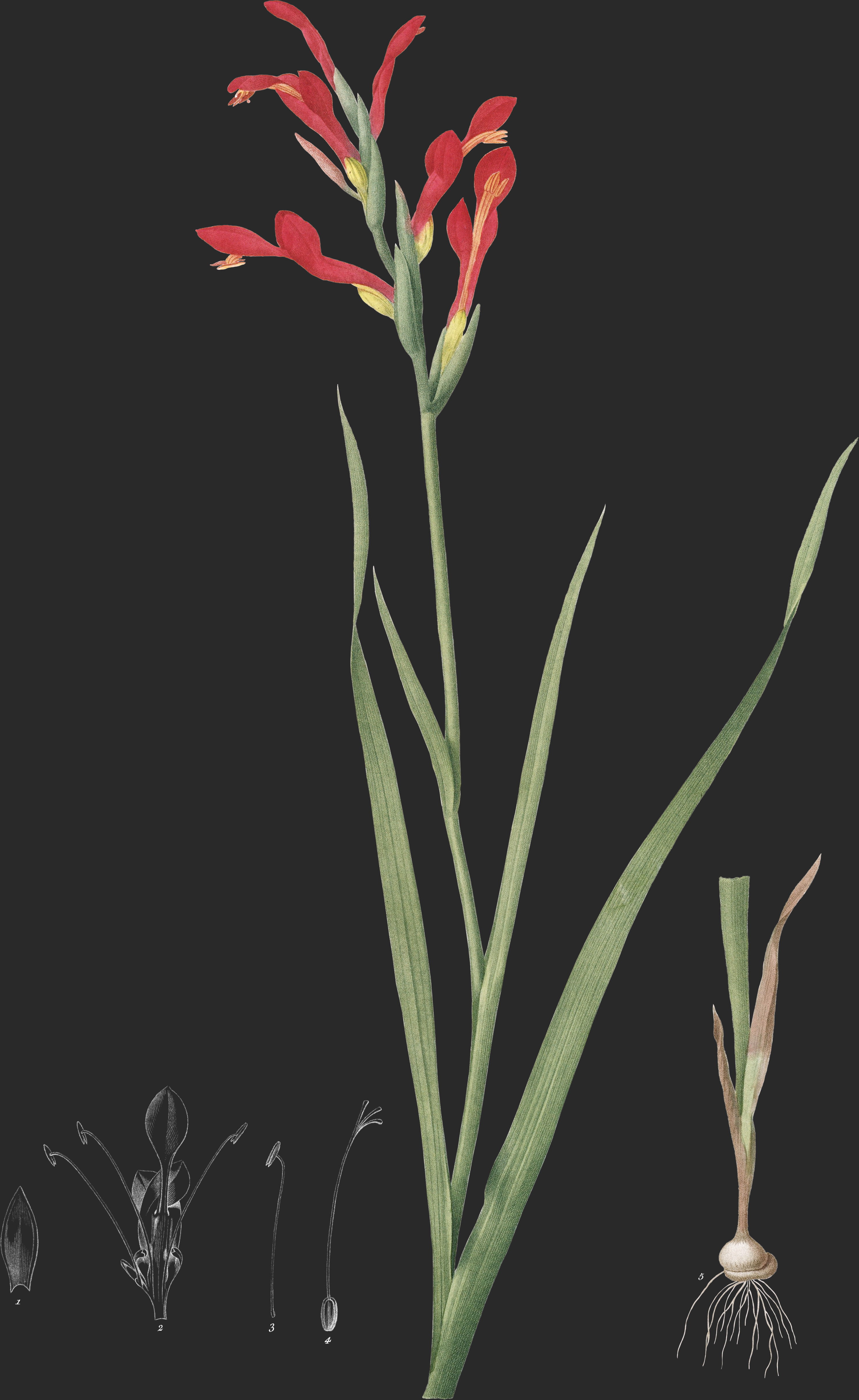 Cette élégante Liliacée se fit remarquer dans les jardins de botanique; non seulement par l’éclatante couleur de coquelicot dont sa corolle est décorée, mais encore par la forme singulière de sa fleur qui, au premier aspect, ressemble à une leur papilionacée.
