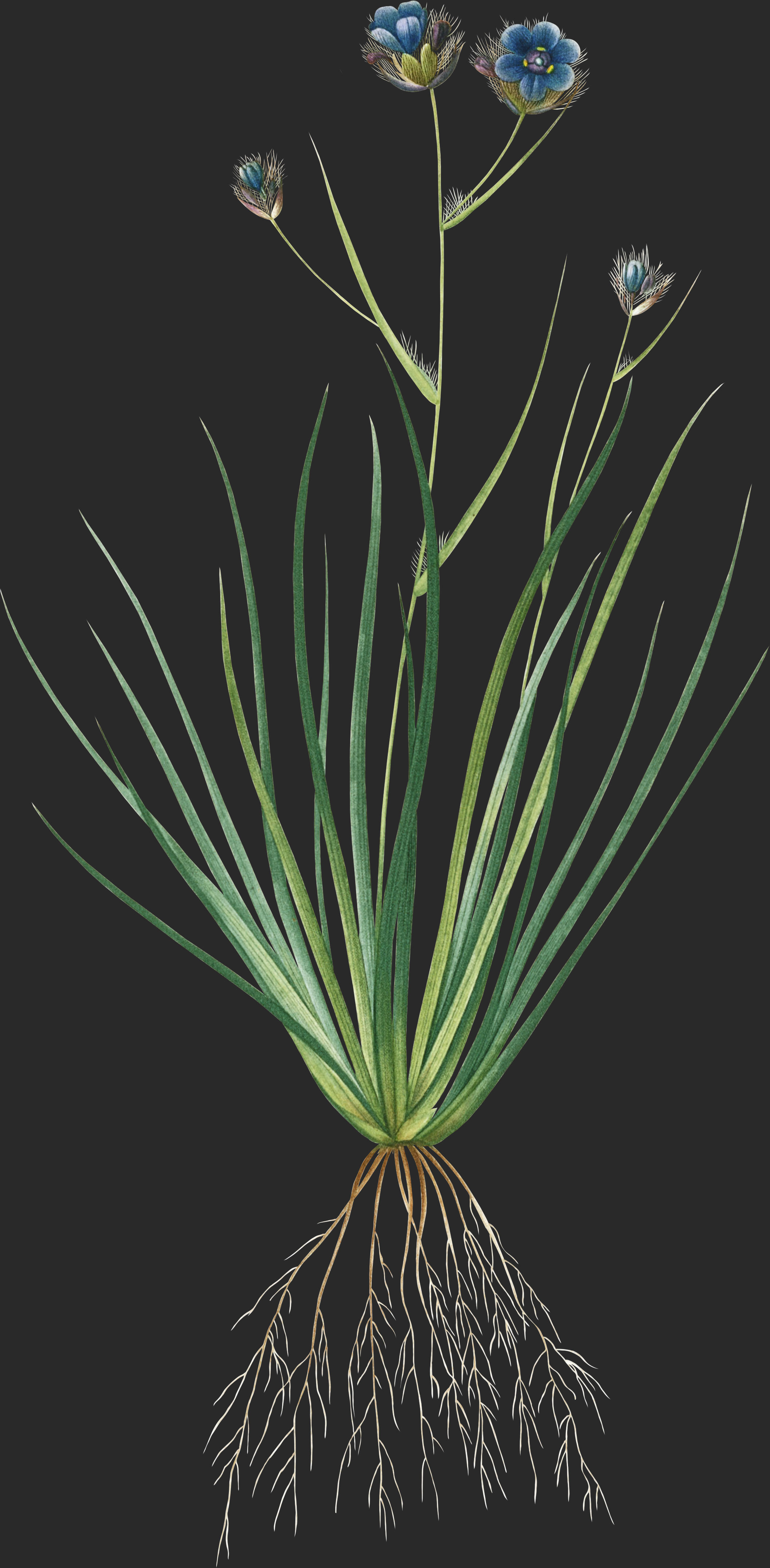 Racine fibreuse, noirâtre, chevelue. Plusieurs faisceaux de feuilles comprimés naissent de cette racine; les feuilles sont linéaires, aigues, en lame d’épée, droites, ou un peu courbées en faux lorsqu’elles naissent à l’extérieur d’une toufle épaisse de la plante. Ces feuilles sont distiques et engainantes par la base, longues de huit à treize centimètres (trois à eing pouces), larges de quatre millimètres (environ deux lignes), très-fisement striées, un peu blanches et cartilagineuses sur les bords, leur gaine est bordée d’une membrane blanche transparente. La tige sort du milieu d’un faisceau de feuilles; elle est compri-ice, anguleuse, haute de deux décimètres (un peu plus de sept pouces). Elle produit une feuille latérale, moyenne, subalée, en gouttière. La tige devient ensuite anguleuse et produit un ou deus rameaux, au-dessous desquels se trouve une feuille courte en gouttière, ciliée sur les bords i sa base. La tige et chacun des rameaux se terminent par une tête de fleurs munie d’un involucre de folioles ciliées. Deux bractées transparentes, extrèmement fines frangées au sommet, accompagnent partiellement chaque fleur et enveloppent l’ovaire. Le périgone est à six divisions presque égales, ovales, en spatule, longues de nenf millimètres (quatre lignes). Les trois extérieures, un peu échancrées au sommet. brunes sur le dos, principalement sur le milieu; les trois intérieures un peu plas petites et moins brunes en dessous. Trois étamines un peu plus courtes que le périgone, à filets pyramidaus subulès, bleus au sommet, naissent de la base des trois divisions extérieures du périgone. Ces étamines ont leurs antheres bilocalaires, oblongues en cœur. Les étamines et les divisions du périgone sont sondées sur l’ovaire par un anneau on tube court, qui laisse un sillon libre à la base do style. Le style est en colonne de la longueur des élamines, terminé par un stigmate formé de trois trompes glanduleuses et repliées en dehors par les bords; ovaire, infère, à trois faces creusées d’un sillon longitudinal, ses angles répondant aux divisions extérieures du périgone et aux étamines. Le fruit est une capsule ovale, tronquée, longue de cing mil limètres (deux lignes et demie), à trois angles en crète répondant à autaat de loges comprimées.