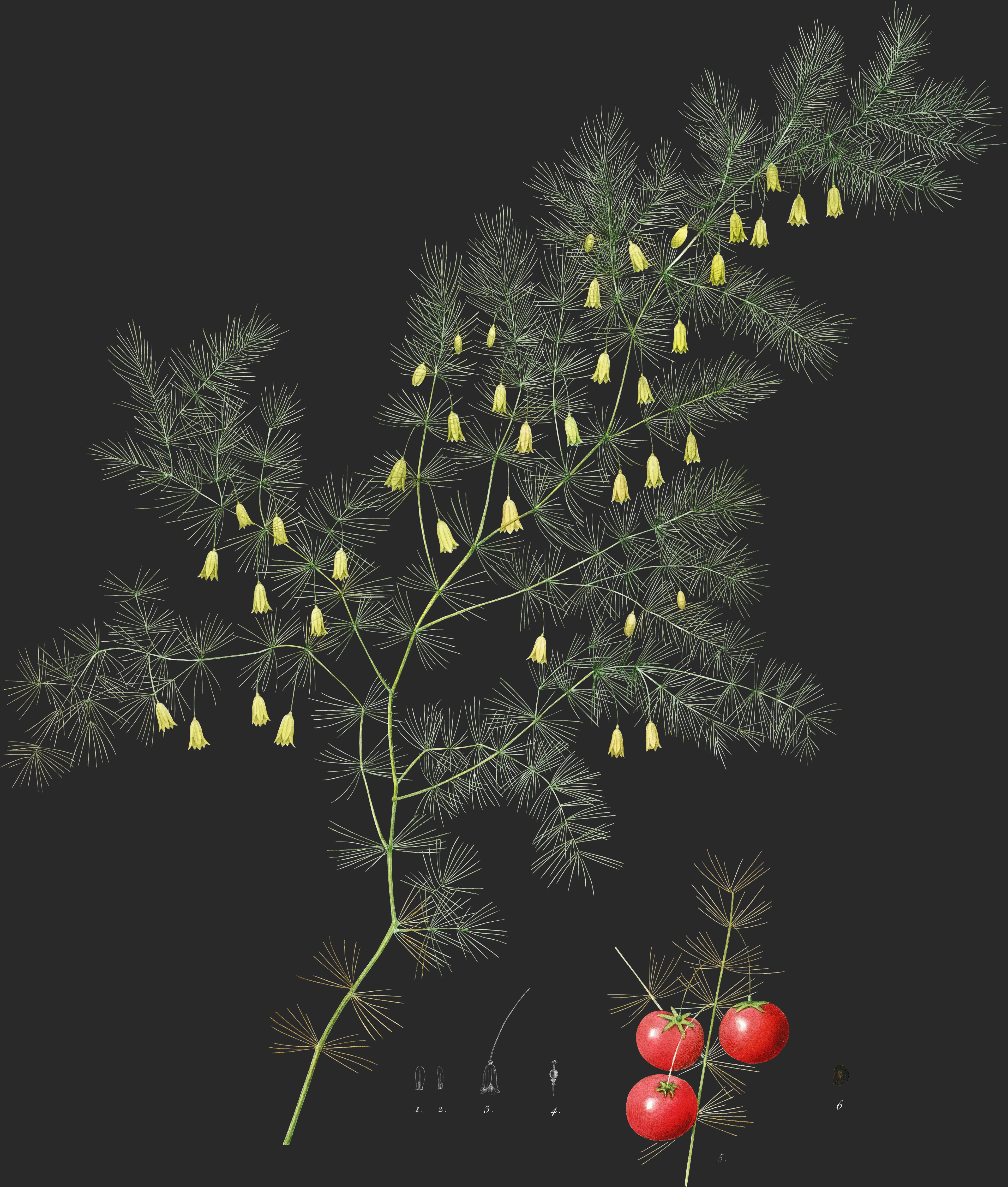 Nous avons vu des ovaires fertiles surmontés d’un style dans beaucoup de fleurs de cette Asperge, tandis que dans d’autres fleurs nous n’avons vu que des ovaires beaucoup plus petits, et ne portant point de style. Ces derniers ovaires sont stériles, ensorte que les fleurs ne doivent point être considérées comme généralement hermaphrodites, mais plutôt comme monoïques par avortement, parce que les tiges à fleurs stériles naissent de la même souche que les tiges à fleurs fertiles, Les fleurs paraissent au mois d’avril sur des pé-doncules, qui n’ont d’abord que la longueur des feuilles, et qui dans le mois suivant s’allongent d’un tiers ou de moitié en sus. Les fruits, à la fin de juin, plus gros que l’extrémité du petit doigt, ne sont point encore colorés.