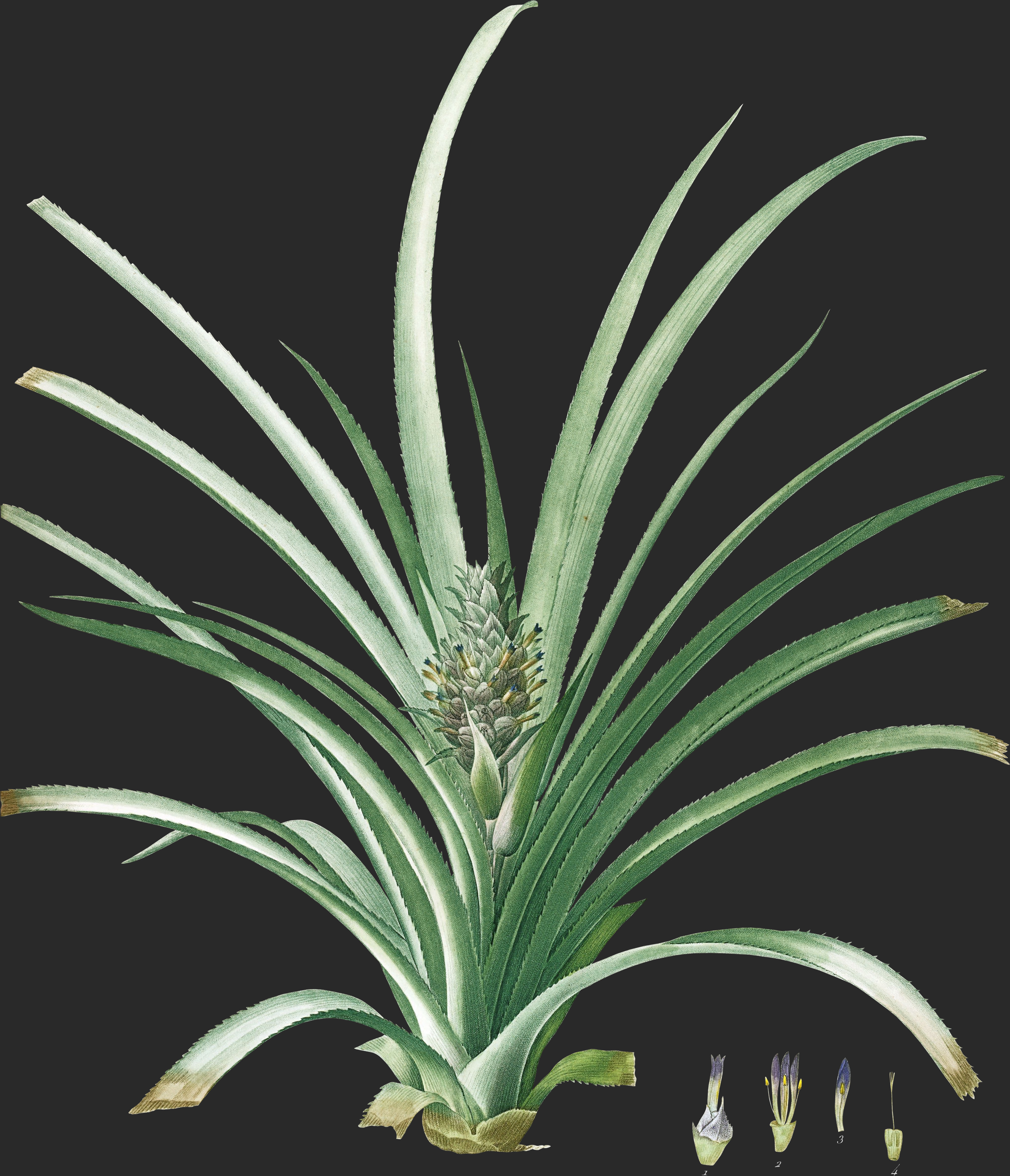 La racine de l’Ananas coltivé est une tubérosité verticalement oblongue, d’un gris noirâtre, garnie d’aspérités entre lesquelles sortent des radicales. Les fenilles forment un large faiscean à la surface du sol. Elles sont en gout-tière, lancéolées, linéaires, aigues, bordées d’épines qui regardent la pointe de la feuille, coriaces, finement striées, principalement en dessous, ois une poussière blanche écailleuse les fait paraitre glauques. La tige centrale et cylindrique est ponctuée, et produit quelques feuilles courtes, alternes. Les fleurs forment, an sommet de la tige, un épi tresdense ou une expèce de cône, étant disposées sur plusieurs rangs en spirales: une toulle de bractées termine l’épi et se change par degrés en une toulle ou conronne de feuilles, que l’on appelle couronne d’Ananas. Il y a une bractée concave et adhérente sous chaque fleur. Le périgone est formée par deux rangs de divisions, trois estérieures, dures, courtes, se recouvrant par leurs bords, et trois intérieures droites, linéaires, se fanant promptement et se tordant en spirale. Il y a six étamines plas courtes que les divisions intérieures du périgone, et dont trois sont opposées à ces di-visions, tandis que les trois autres sont alternes. Les filets des étamines sont linéaires, dilatés à leur base; et ceux de ces filets qui sont opposés aux divisions intérieures du périgone s’engagent dans un sillon ou cannelure de la base de chacune de ces divisions. Lovaire est adhérent et soudé dans la masse charnue commune, d’où naissent les divisions du périgone. Le style est capillaire, un peu plus long que les étamines, et se termine par trois stigmates déliés. Le fruit est un cône épais, ovoide, charnu, divisé à sa surface en aréoles angu-leuses, dont chacane indique la portion fournie & ce cône par la base de chaque llear. Les ovaires, changés en une matière charnue. et développés considérablement avec les bases soudées de toutes les leurs, forment ce fruit aggloméré dans lequel il n y a point de graines.