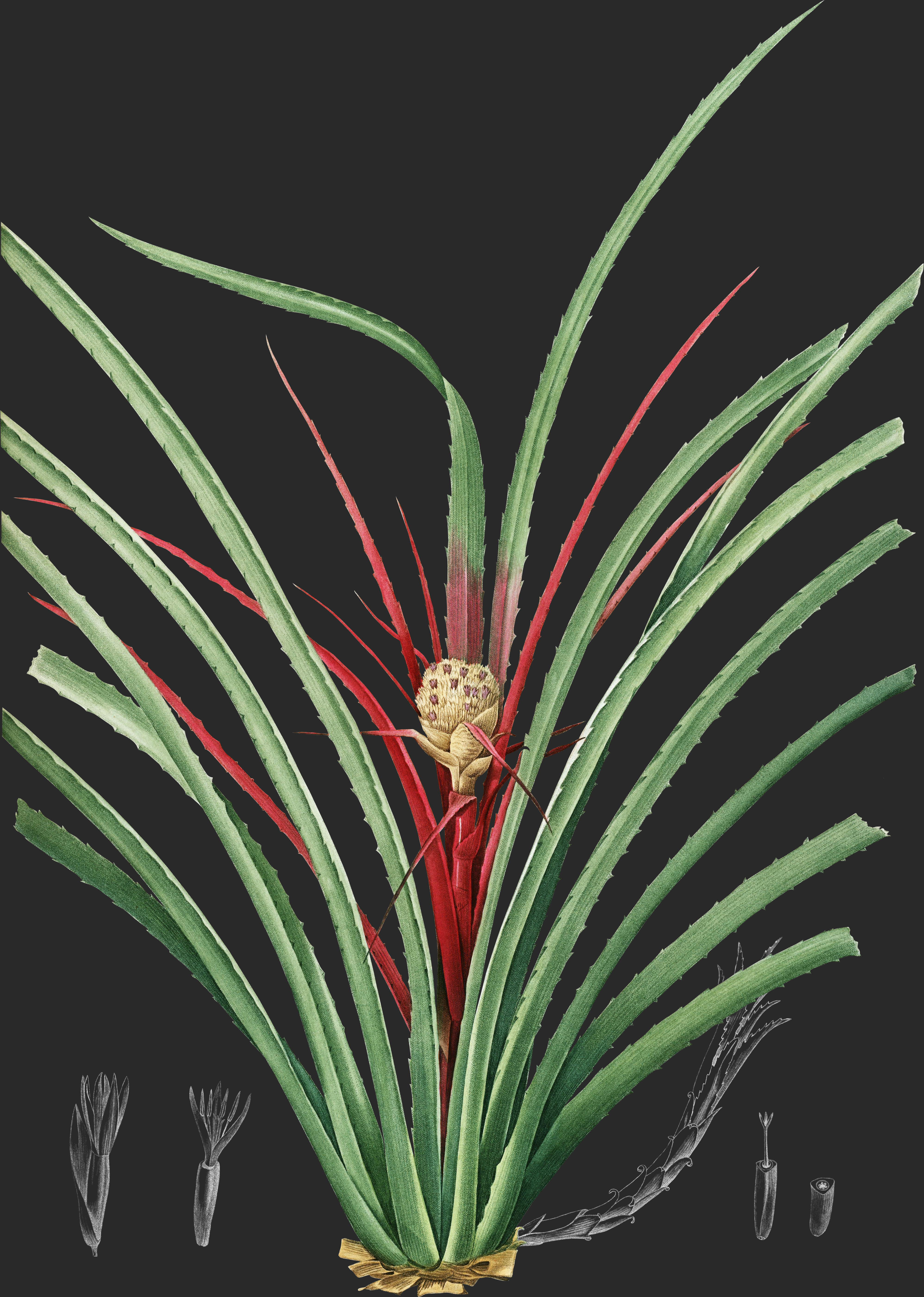 1. Ananas karatas croit naturellement dans l’Amérique méridionale, dans les pays de montagnes, et à l’ombre des arbres, suivant Jacquin, qui nous en a donné l’histoire. Cette plante est appellée Kanaas en langue caraïbe.
