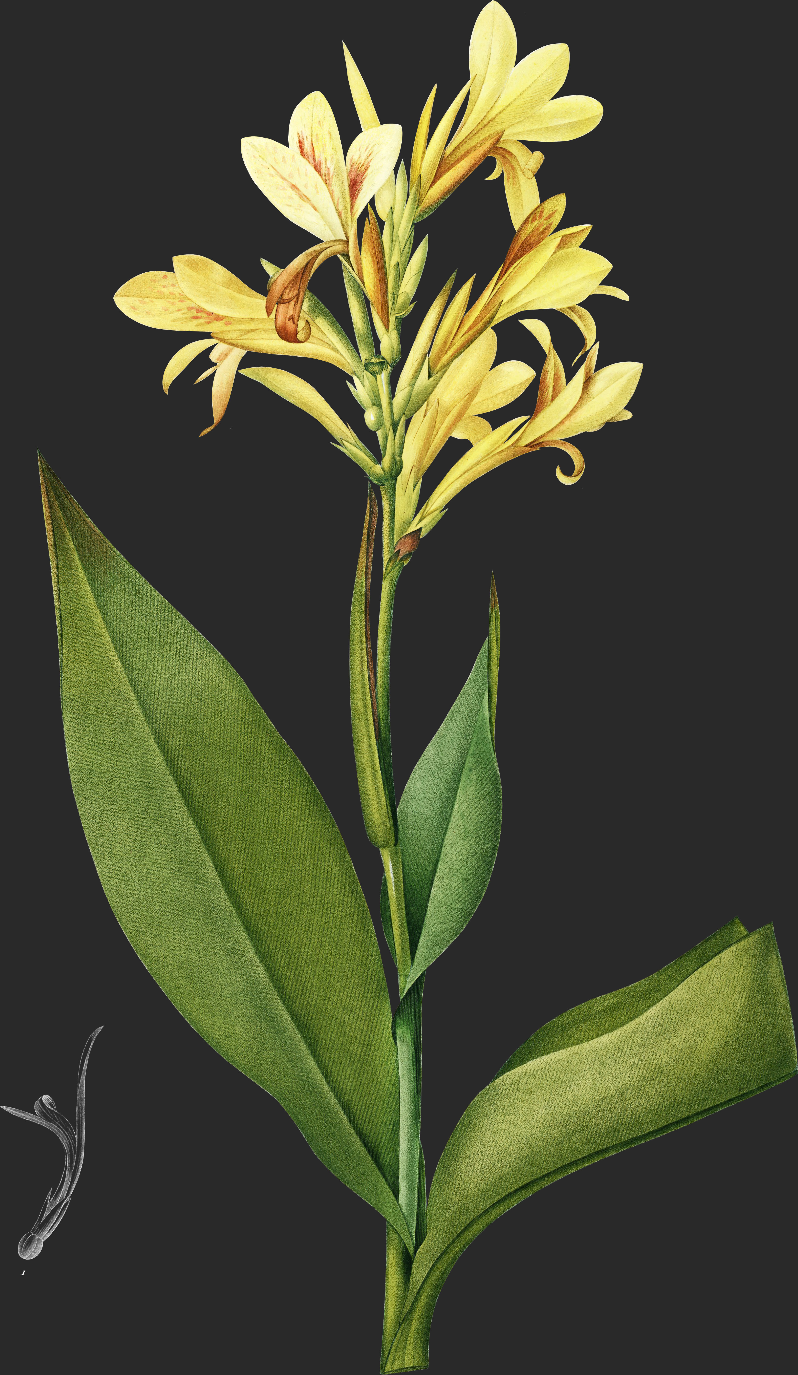 La tige de ce Balisier s’élève à la hauteur d’on mètre environ. Elle est eylin-deique, couverte par les gaines des fenilles dans la plus grande partie de sa longueur. Les feuilles inférieures sont pétiolées; les supérieures, sessiles: toutes sont engainantes. Leur limbe est ovale, rétréci vers ses deux extrémités, plus ou moins concave, aigu, entier, glabre, glauque. Les nervures, si l’on en excepte celle du milieu, sont un peu transparentes, nullement saillantes, et à peine visibles.