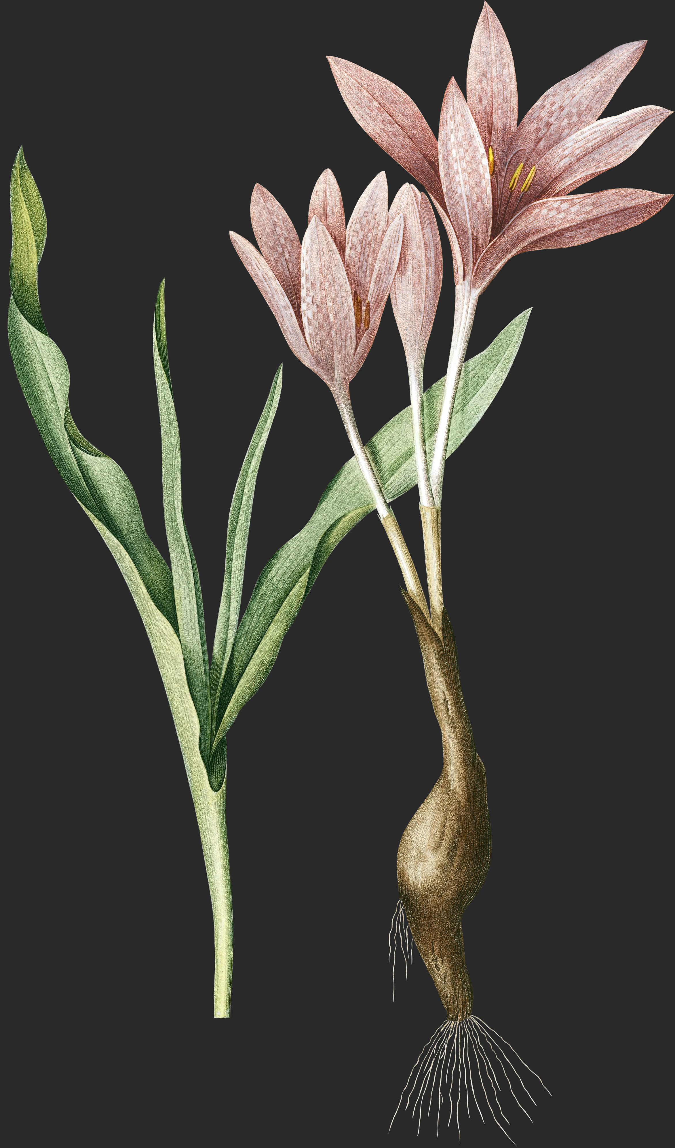 Les feuilles ondulées de ce Colchique, et la disposition des couleurs de ses fleurs, le distinguent suffisamment du Colchique d’automne, avec lequel il a d’ailleurs les plus grands rapports. Son développement se fait de la même ma-nière. Les fleurs paraissent en automne, les feuilles au printemps. Celles-ci naissent, au nombre de quatre environ, d’une bulbe oblongue nullement tronquée à la base et couverte d’une tunique écailleuse, brune et épaisse. Elles sont lancéolées, ondulées sur les borda, aiguës et plus courtes que celles du Colchique d’automne.