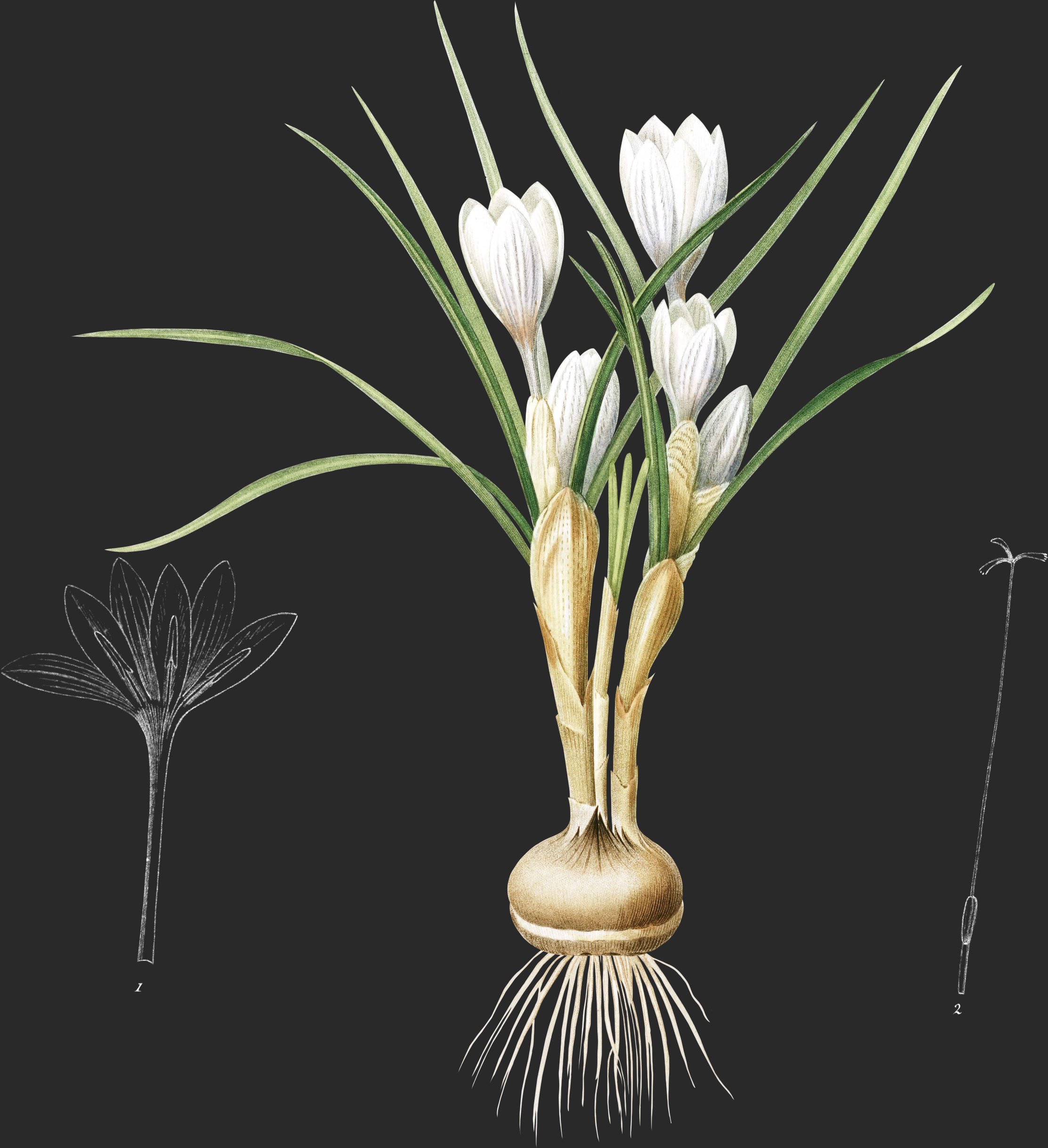 - S. à deux fleurs. Stigmates droits, courts, dentés et de couleur orangée; tubereule radical couvert de tuniques lisses, en forme d’anneaux; toutes les divisions du périgone droites et concaves; fleurs blanches rayées de violet, s’épanouissant au mois de mars.