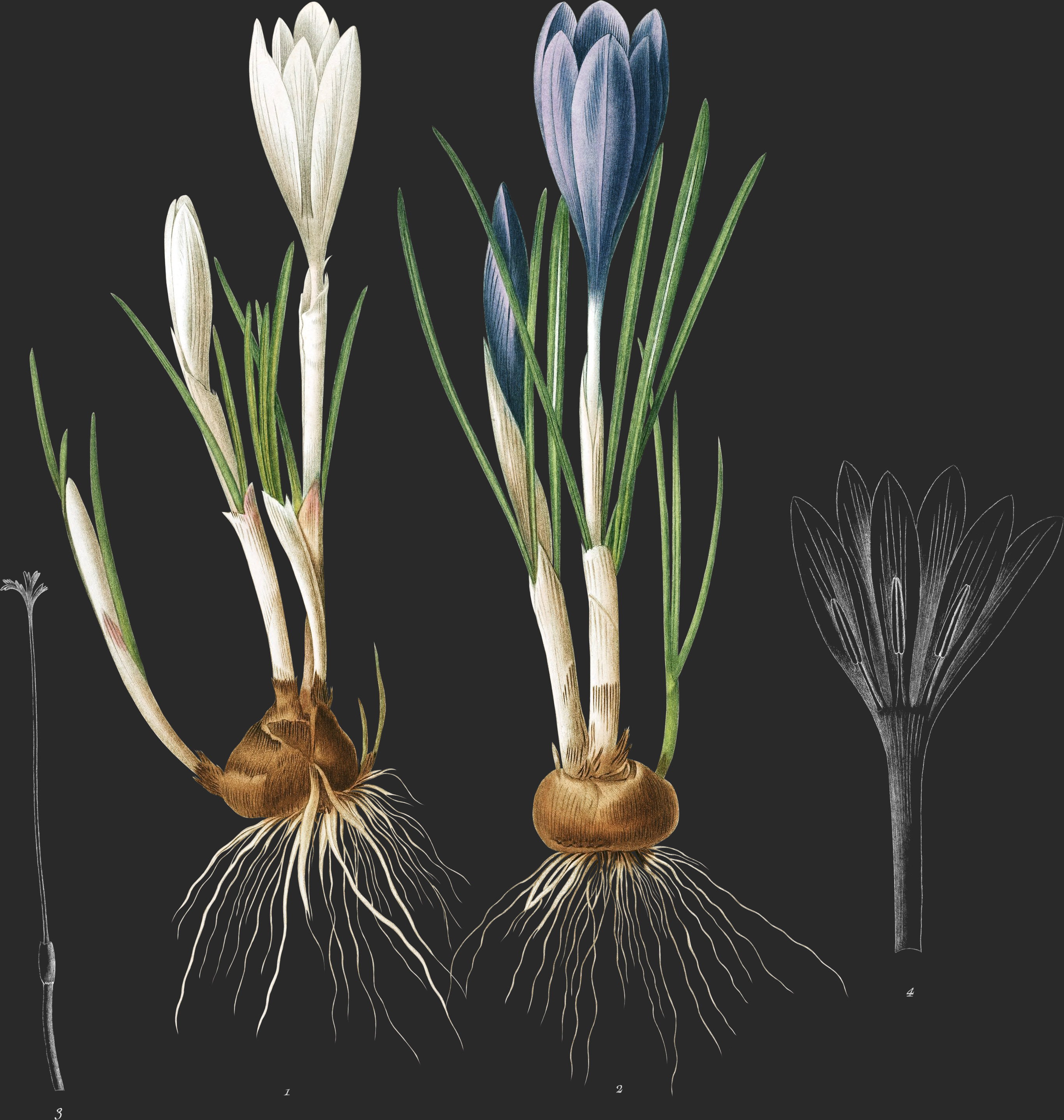 Un double tubercule couvert d’une tunique brune, formée de plusieurs plans de fibres entrecroisées en manière de réseau, émet par en bas des fibrilles radicales nombreuses, et donne naissance par sa partie supérieure à une ou pla sieurs hampes tres-courtes, situées chacune au milieu d’un faisceau de 3 ou 4 feuilles linéaires, planes, glabres, aiguës, larges de 3 millimètres environ, roulées en dehors sur leurs bords, et munies d’une nervure moyenne, blanche, fort développée. Ces feuilles sont, ainsi que la hampe qu’elles entourent, enveloppées à leur base par trois ou quatre gaines membraneuses. Lahampe elle-mème, qui est très-courte et entièrement enfouie dans la terre, est cachée dans une petite gaine membraneuse particulière. Elle porte à son sommet une fleur soli-taire, entourée dans toute la longueur de son tube par une bractée ou spathe membraneuse, qui nait immédiatement au dessous de l’ovaire. Le tabe de cette fleur est grele, cylindrique, plus long, pour l’ordinaire, que les divisions da limbe. Celles-ci sont au mi ibre de six, lancéolées, tantôt obtuses et arrondies au sommet, tantôt plus ou moins aigués. Leur couleur varie beaucoup. Elle est le plus souvent tout-à-fait blanche ou violette: quelquefois elle présente des variétés intermédiaires; quelquefois aussi elle est bleue. A l’entrée du tube est une tonfle de poils glanduleux qui manque dans les espèces voisines. Les filaments des étamines sont blanes, en forme d’alene. Ils supportent des anthères jaunes, linéaires, assez longues et redressées. Lovaire est oblong, triangulaire, marqué souvent de six lignes violettes. Le style est filiforme, blanc, plas long que le tube du périgone, surmonté par un stigmate d’une couleur orangée vive, divisé peu profondément en trois lanières courtes, larges, plus ou moins découpées ou dentées. Tantôt ce stigmate dépasse le niveau des anthères, tantôt il reste au dessous. Il n’exhale aucune odeur. La capsule, de mème forme que l’ovaire, est à trois loges, dont chacune renferme des semences ovales et nombreuses.