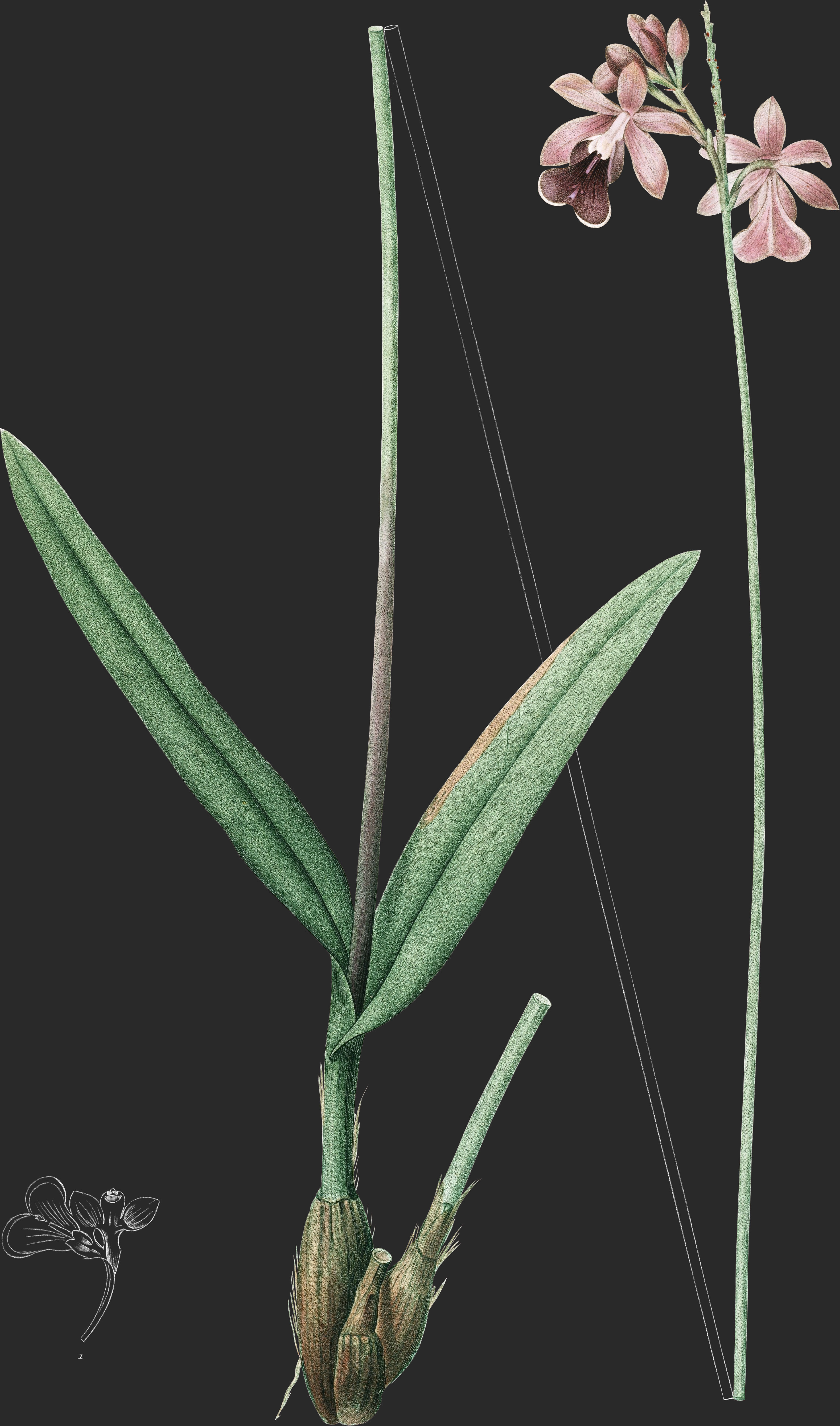 Cette plante, avant sa fleuraison, a quelques rapports avec l’Epidendre à longs cils dont nous venons de donner la description, nais ses fleurs ne lui ressemblent nullement. Sa racine, qui est composée de fibres nombreuses, épaisses, simples et cylindriques, donne naissance à plusiers tigres; ces tiges sont épaisses et comme articulées à leur base; elles deviennent minces un peu au dessous de linsertion des feuilles, poussent à 1 décimètre au plus de leur base deux feuilles engainantes, presque opposées, fermes, oblongues, pointues, un peu rayées en dessus à la place de la nervure longitudinale, mais d’ailleurs 1 lises, sans nervure, et glabres ainsi que le reste de la plante.
