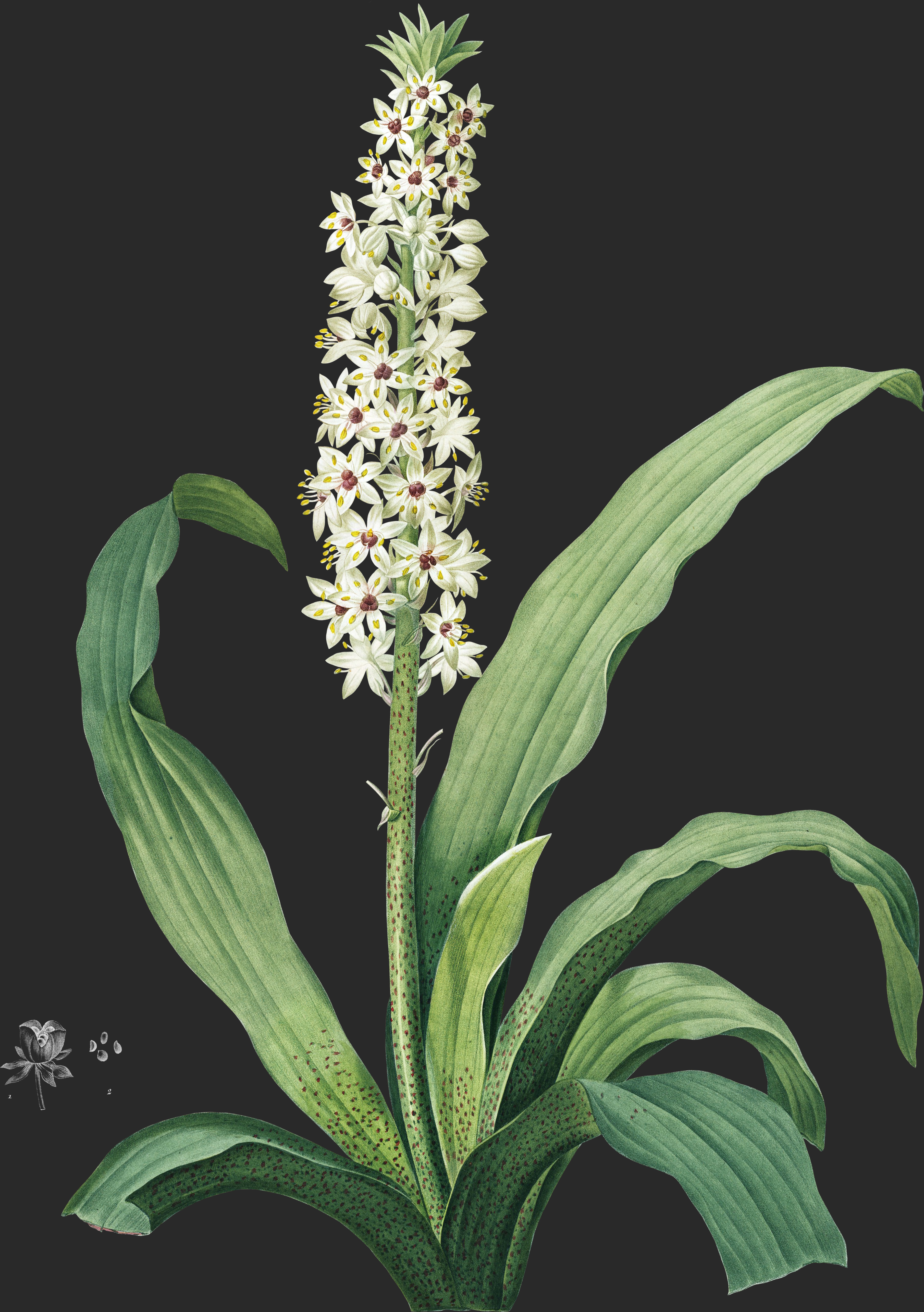 L’Eucomis tachetée est, ainsi que toutes les autres espèces du même genre, indigène du Cap-de-Bonne-Espérance. ♃.