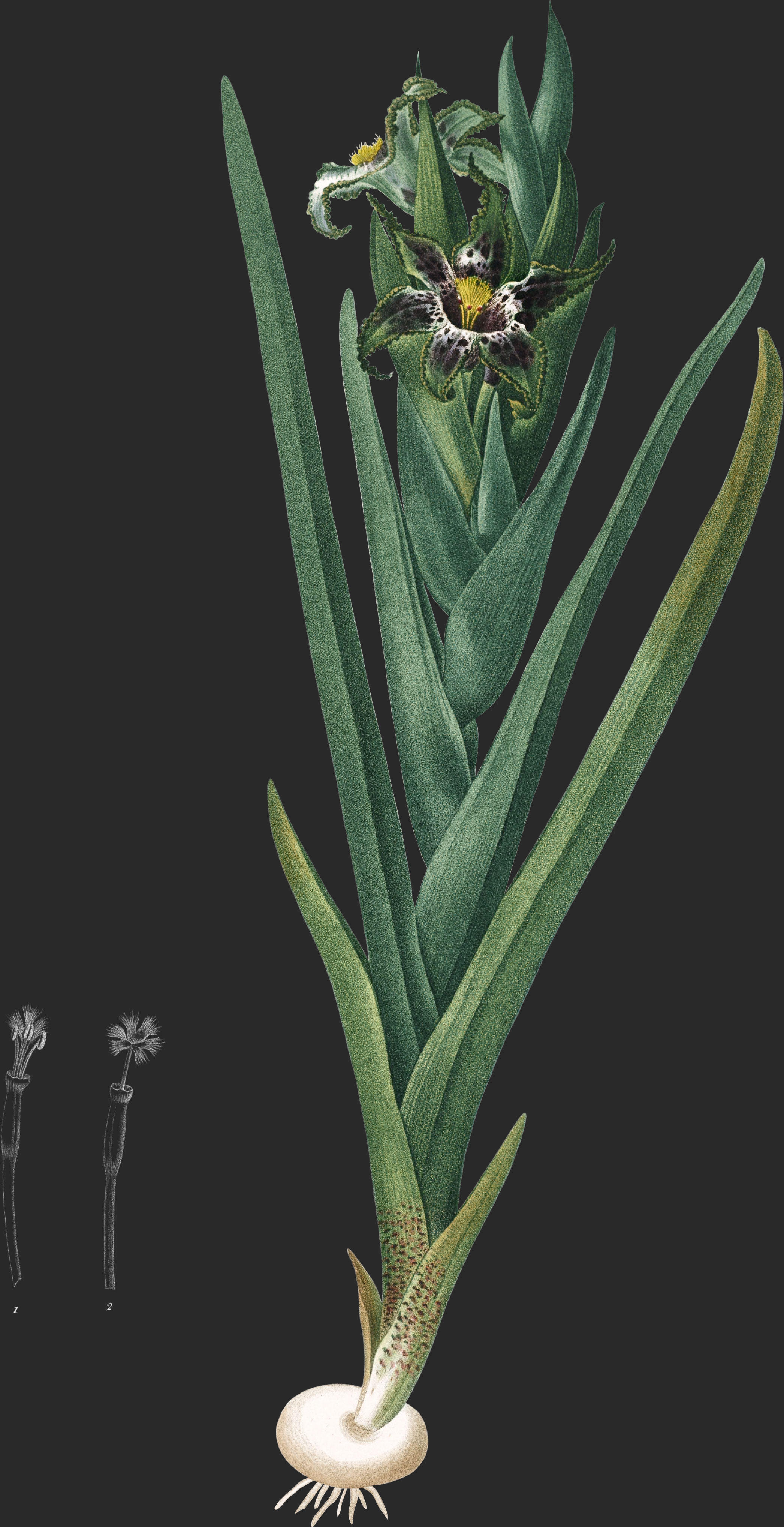 L’ovaire, qui est presque cylindrique, i trois angles obtus et un peu alongés, est placé au-dessous de la fleur; indépendamment de la corolle, il porte trois étamines réunies par leur base seulement, et non dans toute leur longueur, comme dans la Tigridie: ces étamines portent dex anthères oblongues, attachées par le milieu de leur longueur, et qui se tiennent dans une position verticale; du milieu des étamines s’élève un style cylindrique à peu près de la même longueur que les filets: ce style se divise à son sommet en trois stigmates fendus assez profondément, franges et en forme de capuchon.