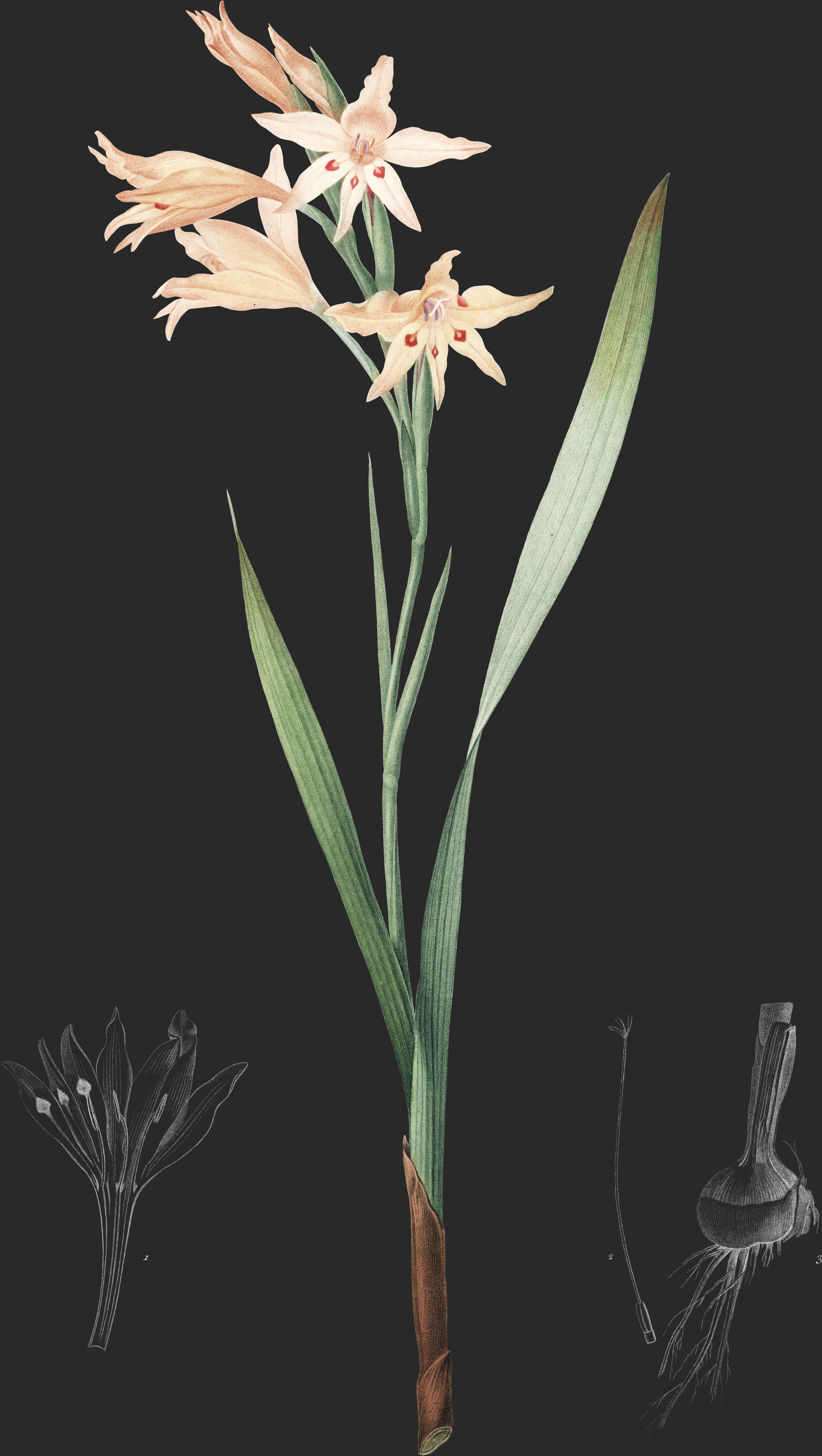 Le Glayeul en pointe est originaire du Cap-de-Bonne-Espérance; il est in-troduit, depuis vingt ans environ, dans les jardins de botanique: on le cultive dans la serre chaude, où il fleurit au premier printemps.