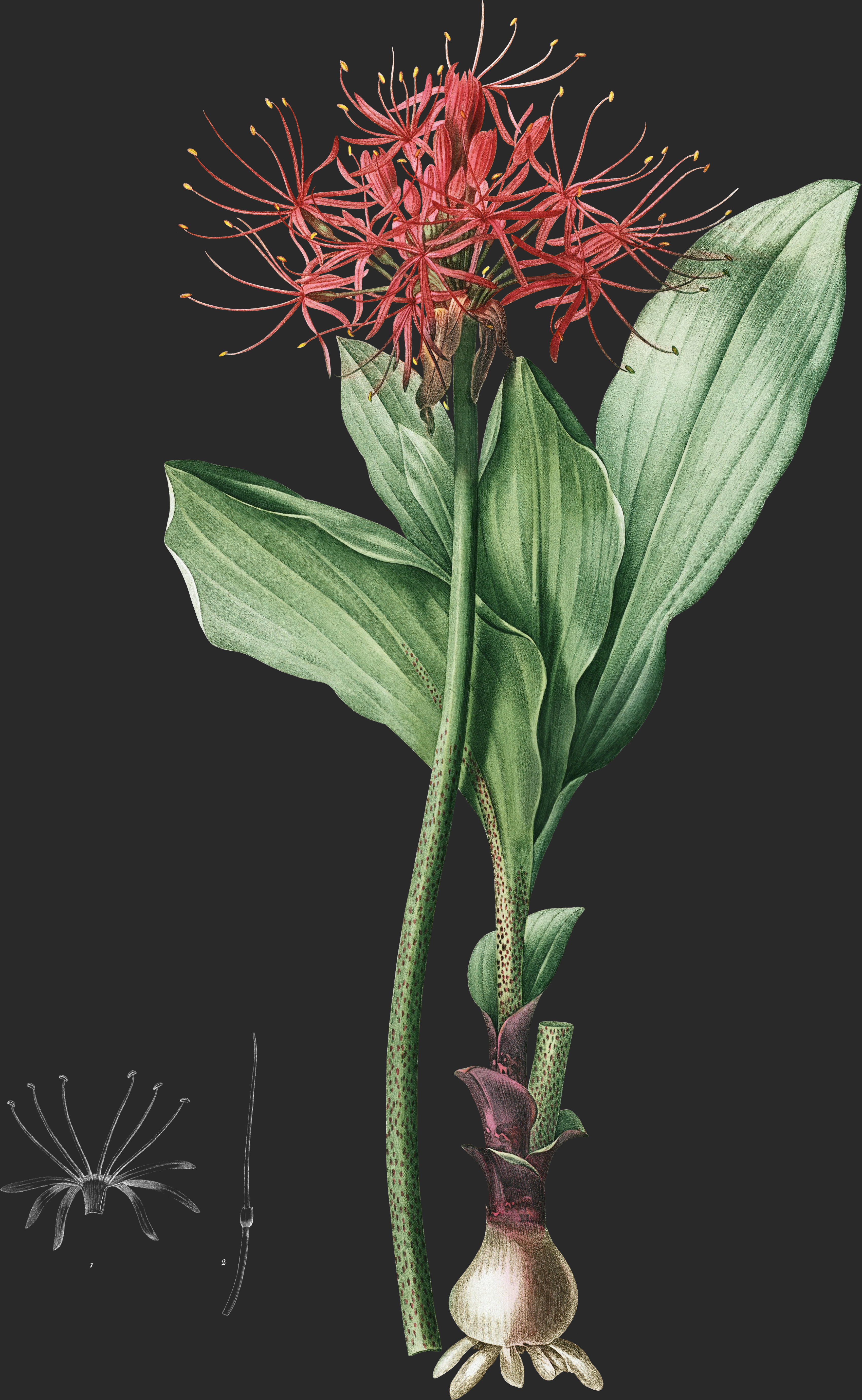 La bulbe de cette belle Liliacée est arrondie, de la grosseur d’un oignon commun. Elle émet des radicules épaisses, peu nombreuses: de son sommet sort un faisceau de feuilles rétrécies en un pétiole large et engainant; les inférieures ont un limbe très-court, obtus, presque avorté; les supérieures sont oblongues, pointues, munies d’une côte moyenne, épaisse, et de fibres toutes longitudinales; les gaines et les fenilles inférieures sont rougeâtres, tachées de points blancs ou verdâtres: toutes ces feuilles sont droites, et non étalées comme dans la plupart des espèces du même genre.