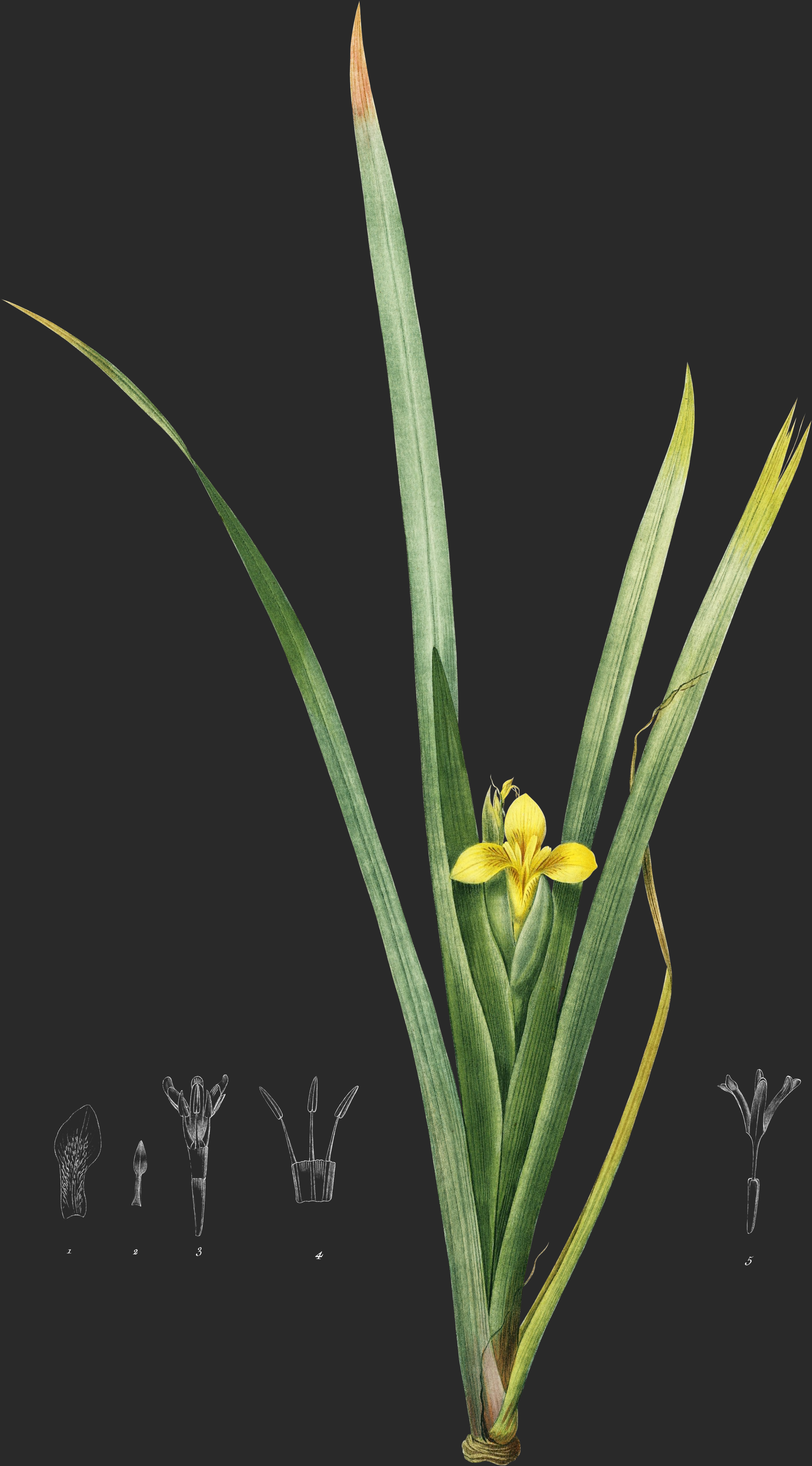 Une racine rampante, charnue, courte, brunâtre, donne naissance à des fibres brunes et nombreuses. De sa partie supérieure sortent un ou deux faisceaux de feuilles droites, comprimées en forme de glaive, lineaires, d’un vert pale nnllement glauque, longues de trois à quatre décimètres, larges de douze à quinze millimètres, serrées les unes contre les autres. La tige, qui nait au milieu d’elles, ne s’élève qu’à la moitié de leur hauteur. Elle est glabre, compri mée avec un de ses côtés tranchant, chargée de deux ou trois feuilles, qui conjointement avec les radicales, dont elles ne diffèrent que par leur lon-gueur, la couvrent presque entièrement.
