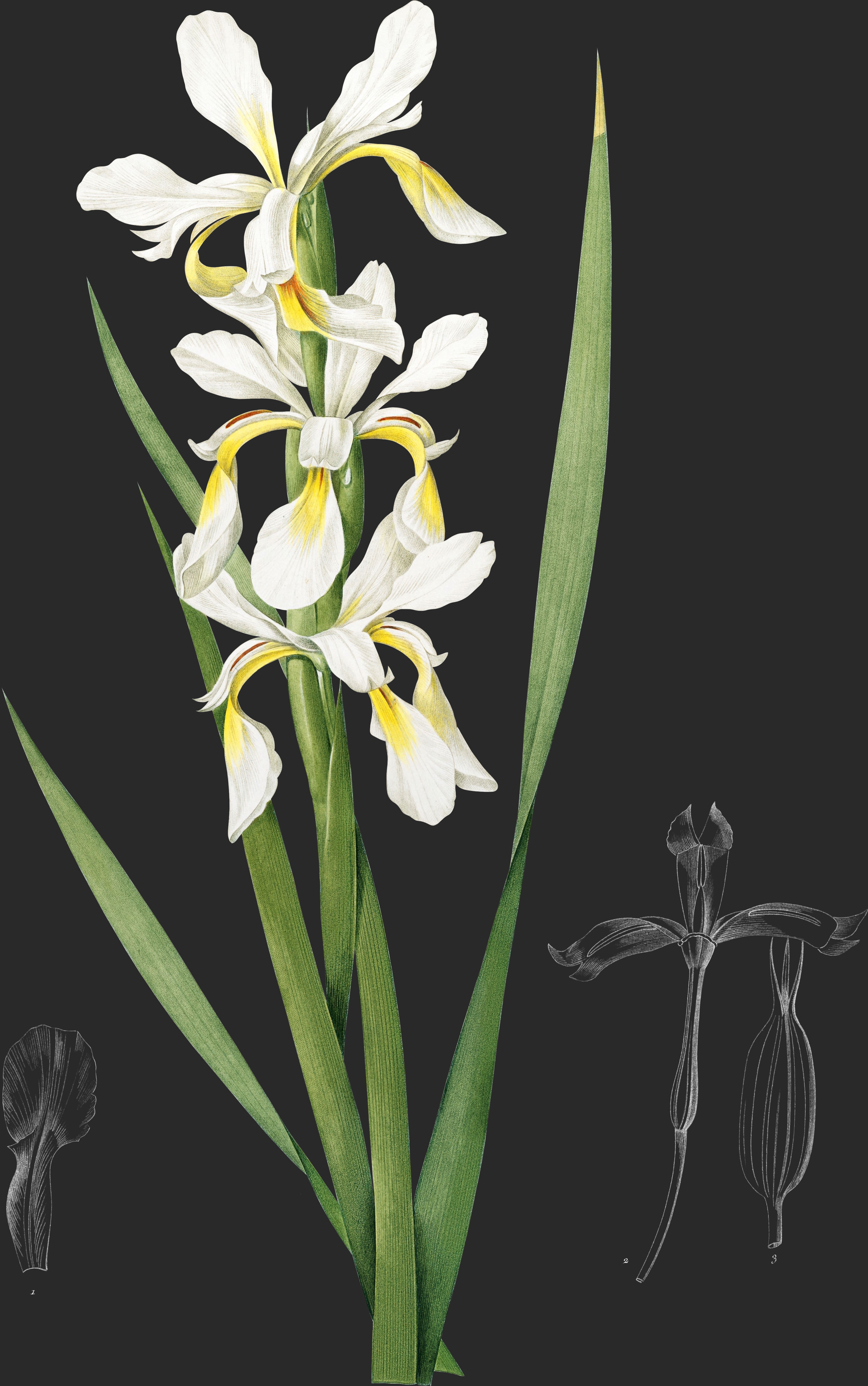 L’Iris jaune-blanche croit dans la Sibérie et le Levant. Elle réussit très-bien dans les parterres, où elle fleurit au mois de juin.