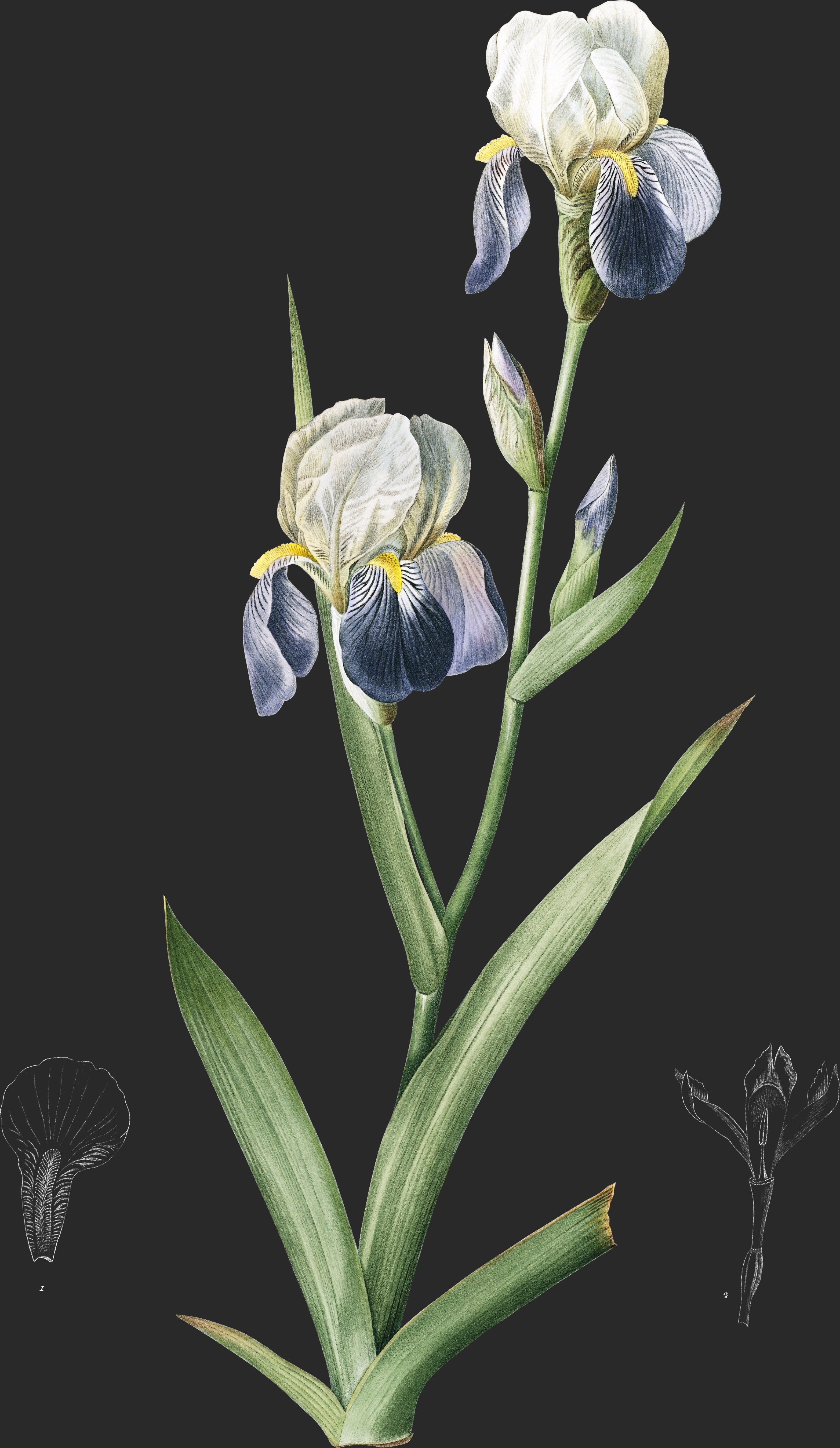 La racine de cette Iris ressemble à celle de l’Iris Germanique. Les feuilles, qui pour la plupart en naissent immédiatement, sont linéaires-lancéolées, comprimées en forme de glaive, un peu courbées en faux, glabres, marquées de nervures saillantes, comme plissées en long, larges de trois ou quatre centimètres, et un peu plus courtes que la tige. Celle-ci est haute d’un mètre environ, droite, glabre, cylindrique, chargée d’un petit nombre de feuilles qui ne la cachent presque point. Elle émet, dans sa partie supérieure, deux ou trois rameaux, dont chacun porte deux grandes fleurs à son extrémité. Ces flears, qui exhalent une odeur assez agréable analogue à celle du sureau, sont entourées, à leur base, par une spathe commune formée de deux folioles ovales-lancéolées, aigués, concaves, membraneuses et blanches sur les bords, foliacées dans leur partie moyenne, qui est verte ou rougeâtre. Entre les fleurs est une troisième Foliole assez semblable aux deux extérieures. A la base de chaque rameau sont deux bractées opposées, lancéolées, membraneuses sur les bords.