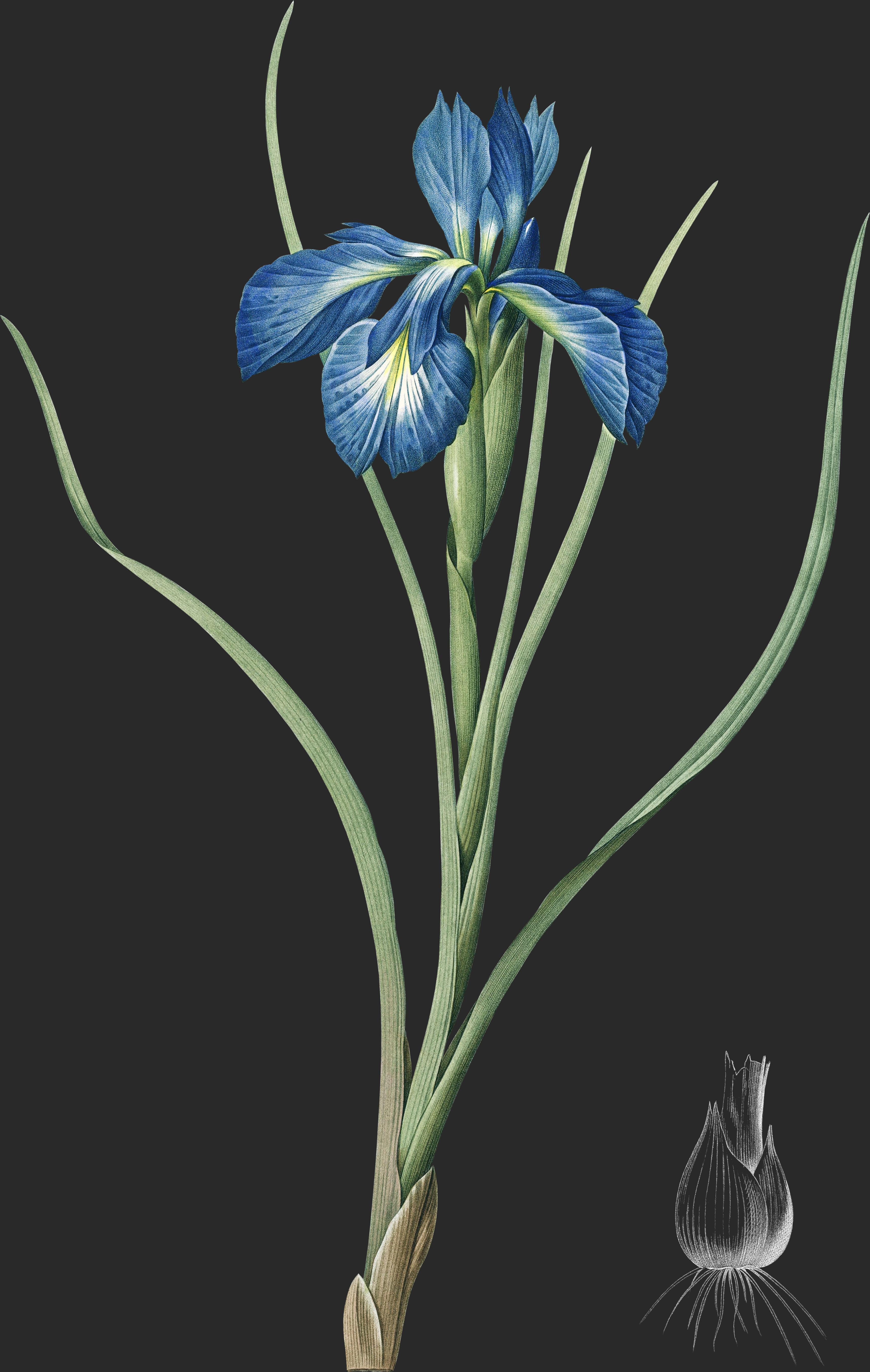 De ces spathes sortent ordinairement deux fleurs qui ne se développent que l’une après l’autre: elles sont grandes, d’un bleu tirant un peu sur le violet, mais plus claires que dans l’Iris germanique. Dans certains pieds, on remarque que les fleurs sont mouchetées de petites taches éparses d’un violet plus foncé.