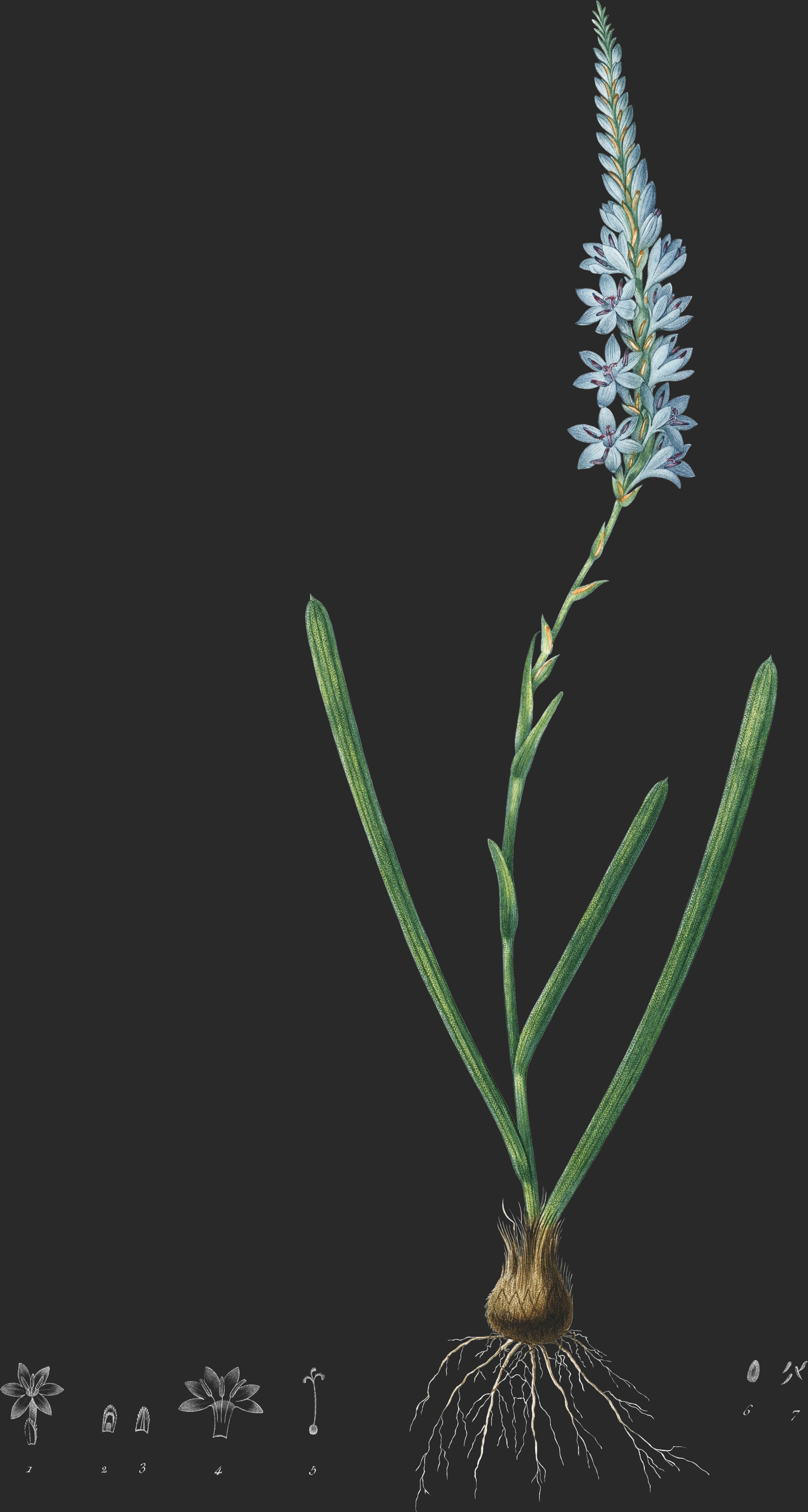 Les fleurs sont d’in bleu clair tirant sur le gris de lin, sexsiles, disposées sur deux range opposés et serrés, d’où résulte un épi comprimé et embriqué; la base de cet épi offre souvent plusieurs bractées, dont les fleurs sont avortées; chaque fleur nait entre deux bractées opposées, ovales, embrasantes, incgales, membraneuses sur les bords, déchirées vers le sommet, persistentes et longues de 6–8 millimètres; la corolle est monopétale, adhérente par sa base avec l’ovaire, en forme d’entonnoir; son tube est eylindrique, presque droit, deux fois plus long que les bractées; son limbe est à six parties égales, oblongues, obtuses, étalées, un peu courbées en carène; les étamines sont au nombre de trois, attachées au tube de la corolle, et libres près du sommet, uo peu plus courtes que le limbe, droites, un peu ascendantes du côté supérieur de la fleur; leurs filaments sont blancs; les anthères sont linéaires, insérées par leur centre, de couleur violette, à deux loges; le pistil a son ovaire ovoide, presque triangulaire, caché sous les bractées, adhérent avce la corolle; le style est blane, filiforme, de la longueur des étamines, terminé par trois stigmates réfléchis et en forme d’alène: le fruit m’est inconnu. D’après le dessin conservé dans les vélins du Muséum, il parait être une capsule ovale-oblongue, qui contient plusiours graines longues et menues.