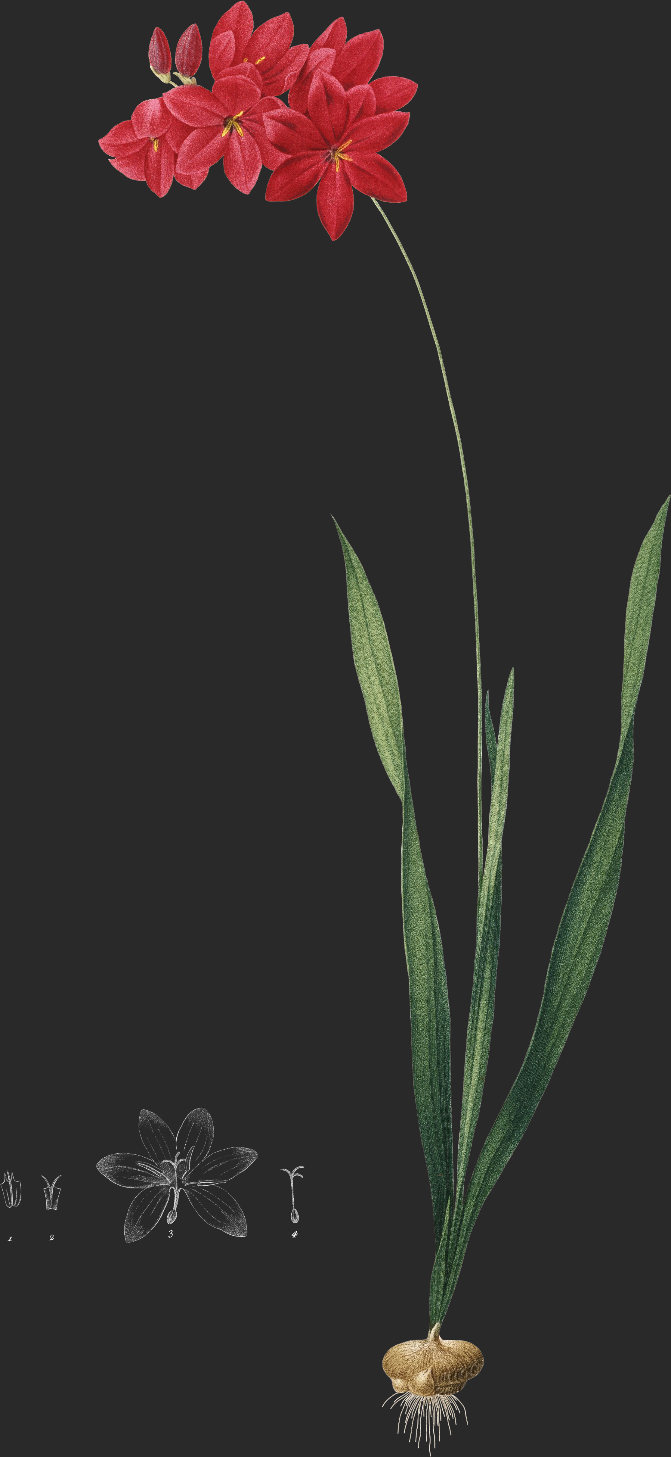 Au milieu du genre des Ixias, dont le botaniste et le cultivateur admirent à l’envi Télégance et la variété, cette espèce se fait encore remarquer par son épi serré et d’un beau rouge cramoisi, placé au sommet d’une hampe gréle et déliée.