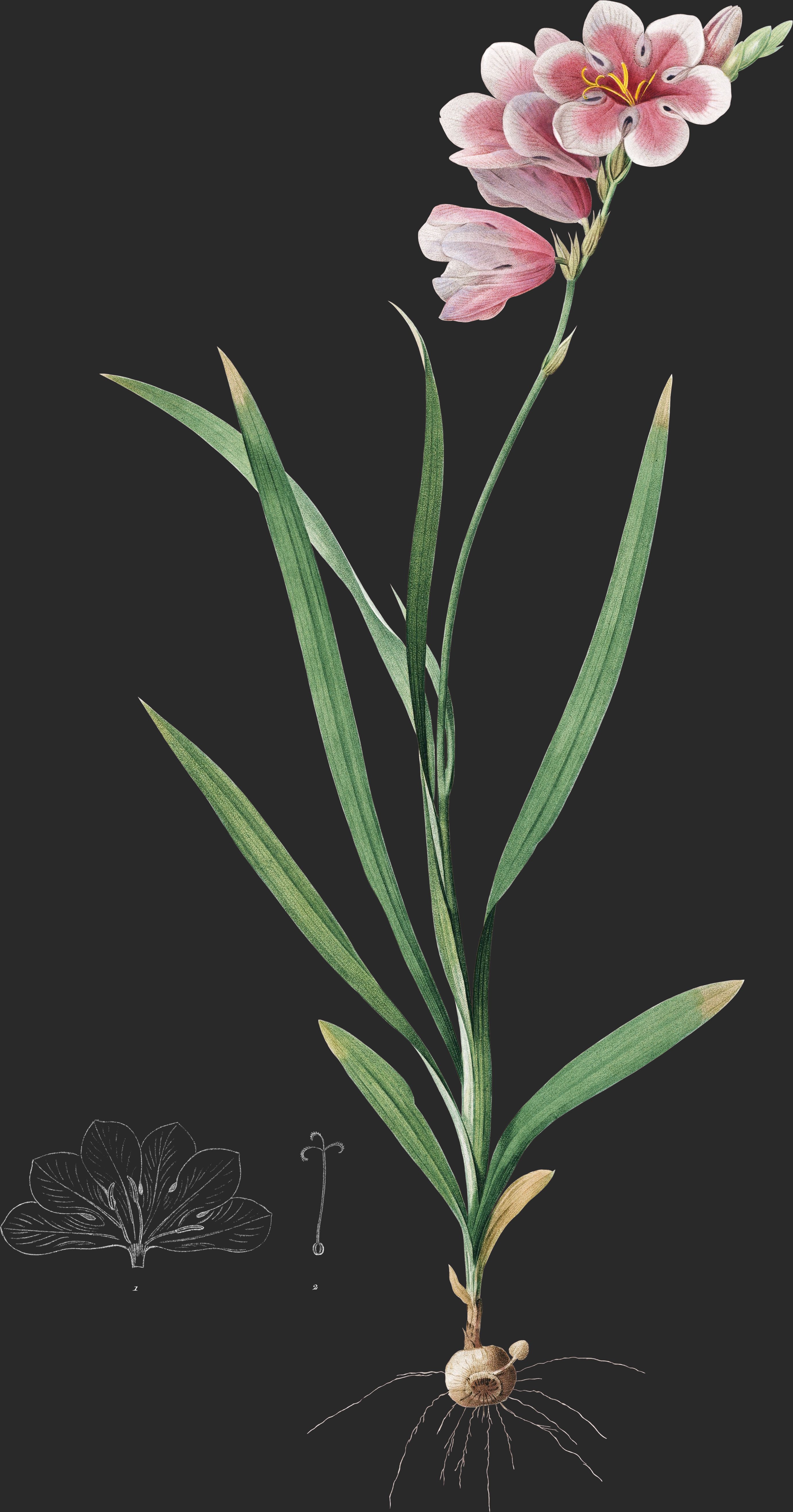 Cet Ixia se reconnait, des la première vue, à ses grandes fleurs d’un rose cramoisi, dont les lanières sont transparentes sur les bords dans toute leur partie inférieure.