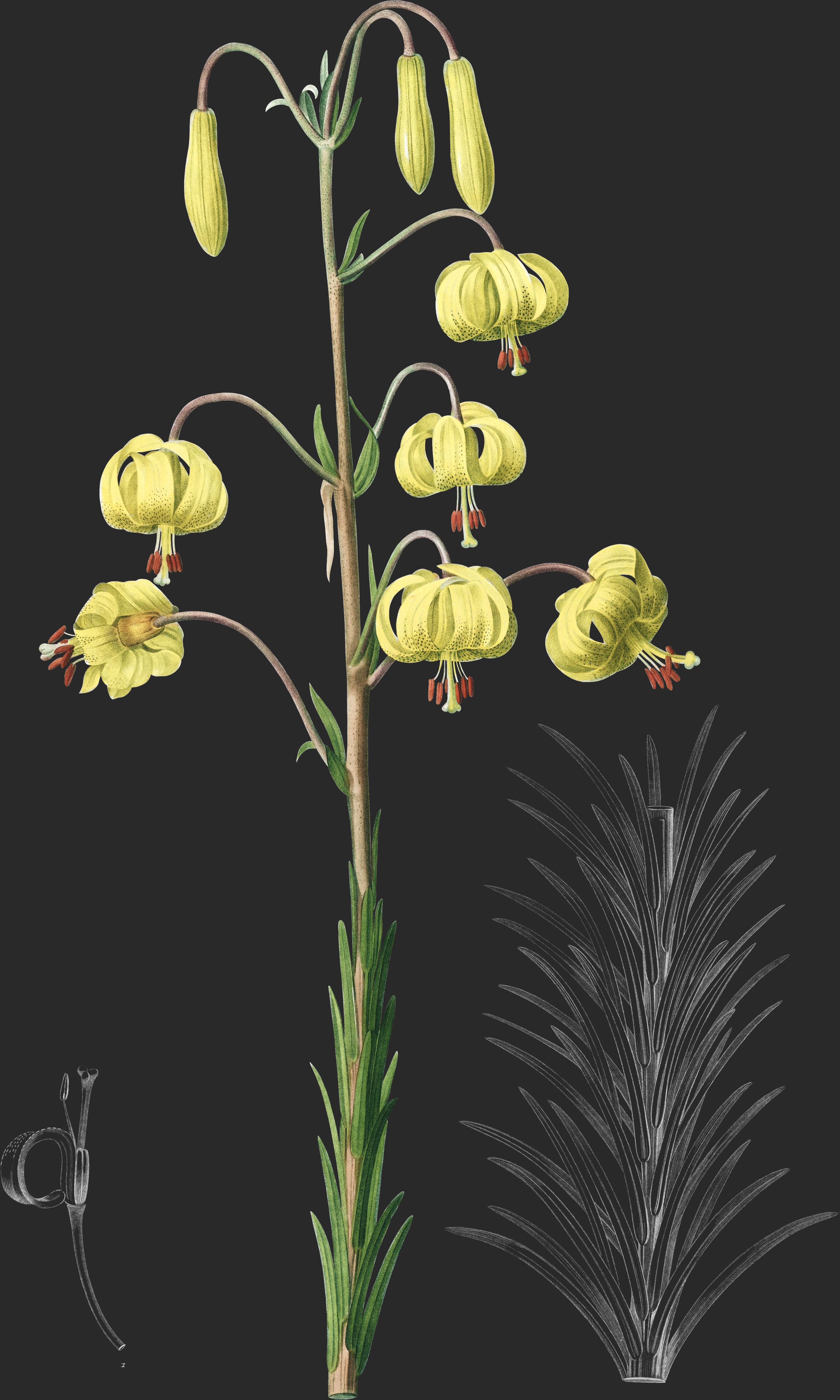 Cette plante a beaucoup de rapport avec le Lis pompon que nous avons représenté, planche 7 de cet ouvrage; mais elle parait en dillérer d’une manière constante par ses fleurs jaunes en petit nombre, et presque disposées en ombelle.