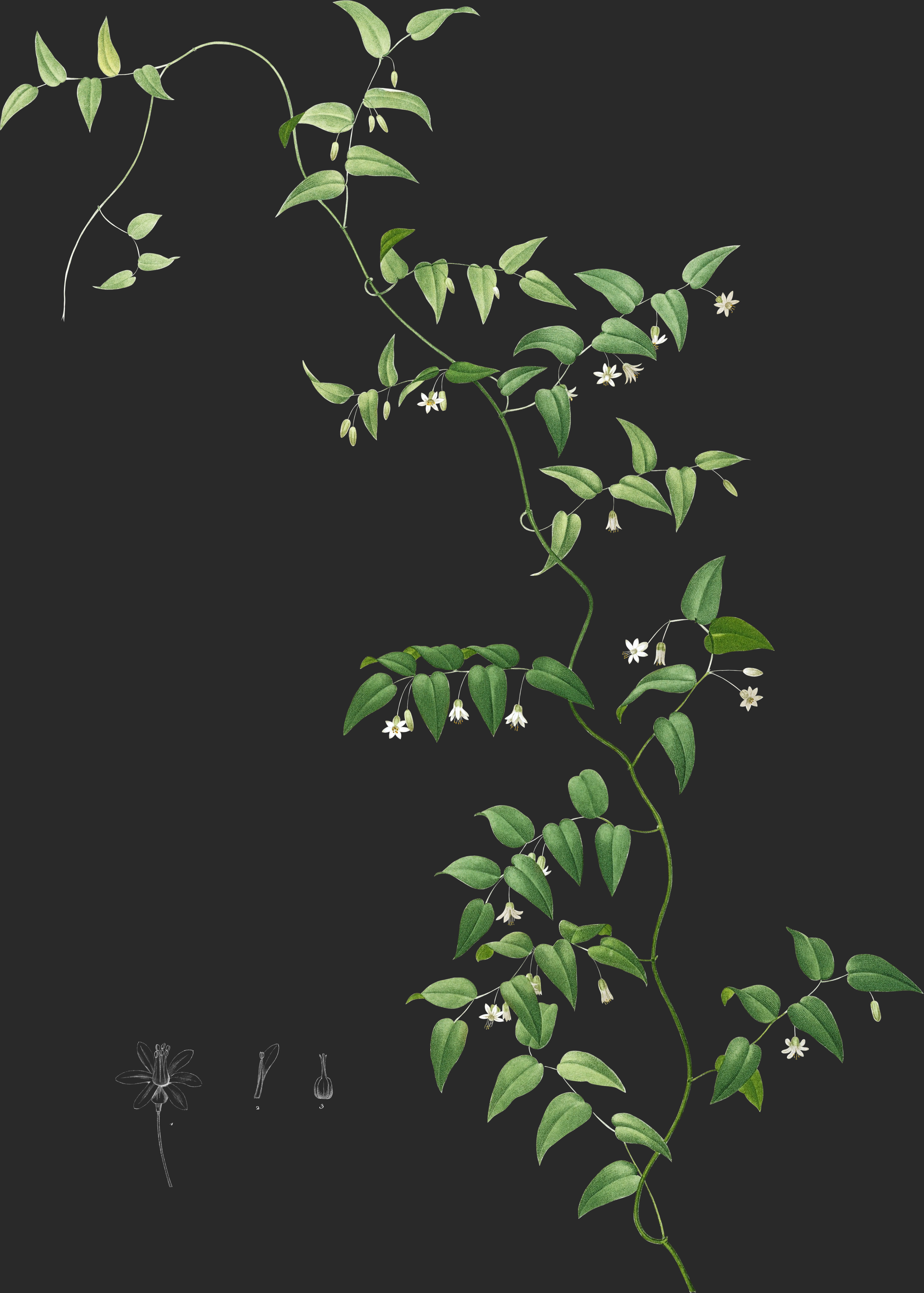 Tige sarmentense, grimpante, flexueuse, haute d’un mètre à un mètre et demi (de trois pieds à quatre pieds et demi), garnie de rameaux courts, alternes et comme distiques, assez réguliers, un peu en zig-xag, et qui portent six à dix feuilles. Une petite stipmle membraneuse est placée sous l’aisselle de chaque rameau. Les feuilles sont alternes, et chacune d’elles est accompagnée en dessous d’une petite stipule; elles sont sessiles, solitaires, ovales, tres-aigues à leur sommet, arrondies et un peu en cour à leur base, un peu obliques, ayant leur nervares parallèles et longitudinales, sans côte moyenne. Ces feuilles sont un peu luisantes et d’un vert très-gai.
