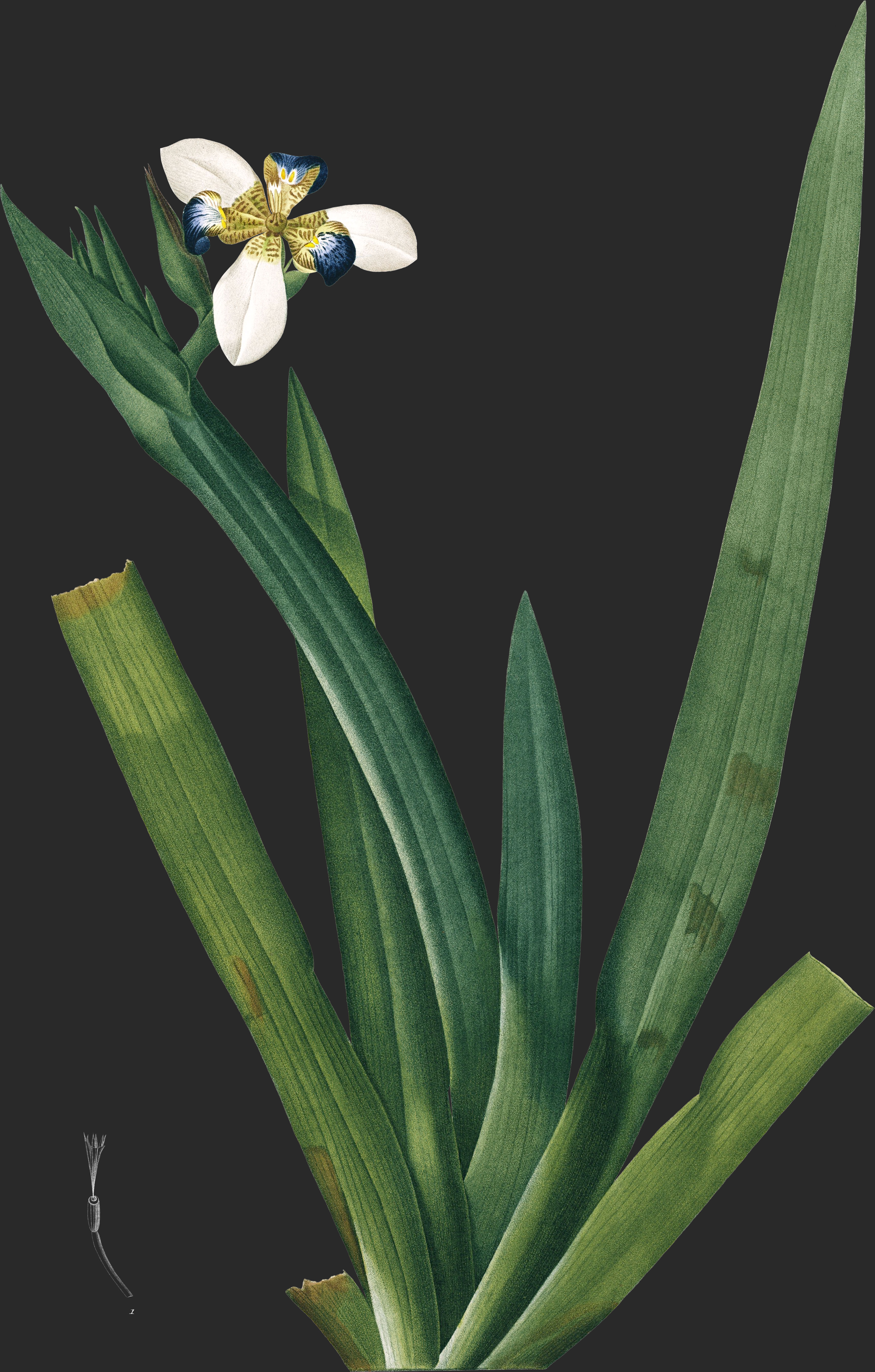 Une racine, composée de fibres épaisses et presque simples, donne naissance à plusieurs feuilles radicales disposées sur deux rangs opposés en forme d’éventail, comme dans les Iris, engainées par leurs angles, fortement com-primées, lancéolées, pointues, glabres, entières, droites, un peu arquées, surtout au-dessus de leur gaine, d’un vert foncé, et de 6–7 décimètres de longueur.