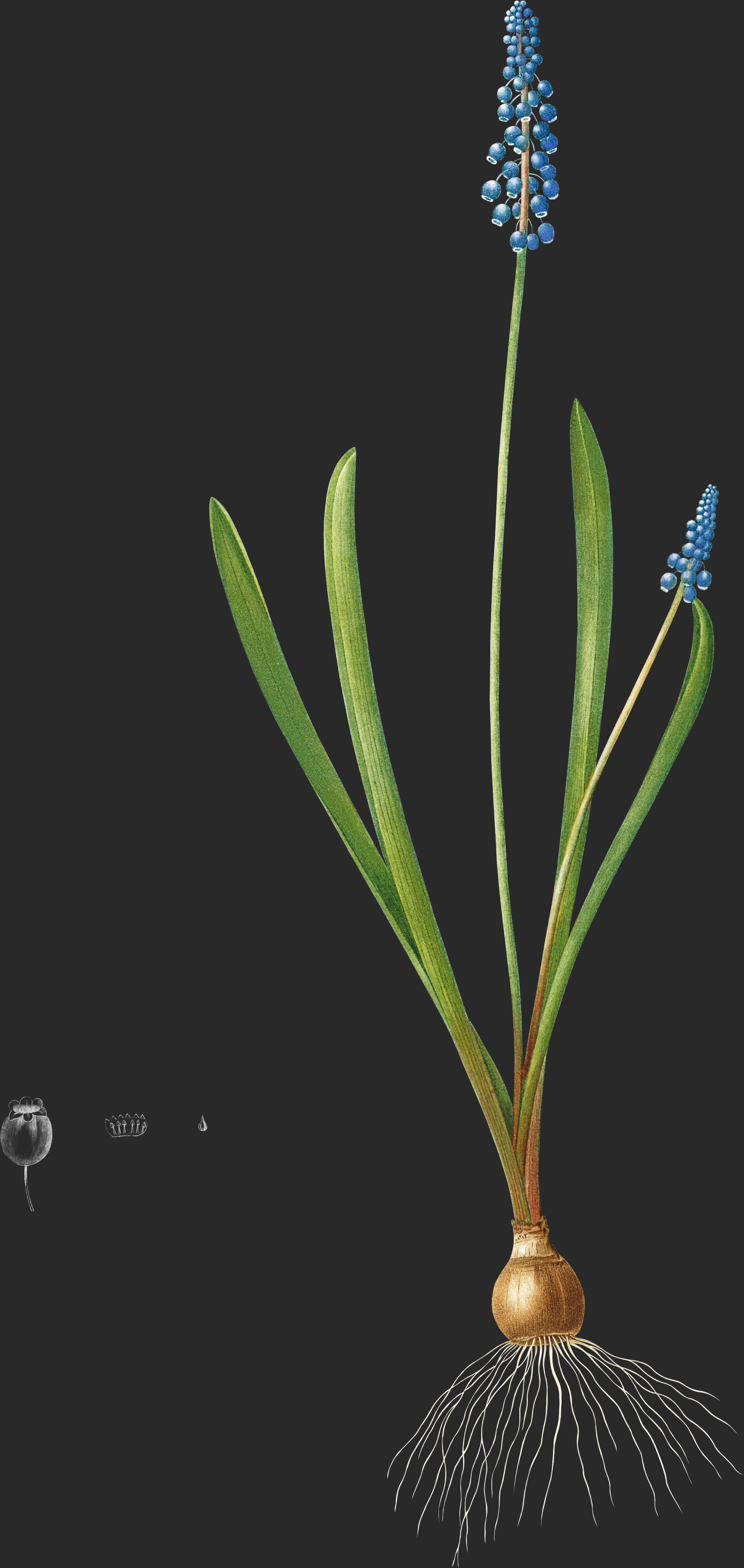 Cette jolie petite plante diffère du Muscari à grappes, avec lequel elle a d’ailleurs beaucoup de rapports, par ses feuilles plus larges et plus droites, par ses fleurs plus écartées, et par la forme presque sphérique do périgone. Sa bulbe est ovale, de la grosseur d’une petite noix, couverte de tuniques d’un bran pale. Elle émet un faisceau de quatre ou cinq fenilles dressées, fermes, linéaires, longues de près de deux décimètres, larges d’un centimètre, courbées en gouttière, comme demi-cylindriques, striées sur le dos, un peu obtuses, d’un vert pale. Entre ces feuilles s’élèvent, à la hauteur d’environ deux décimètres et demi, une ou deux hampes cylindriques droites, marquées de points d’un rouge brun.