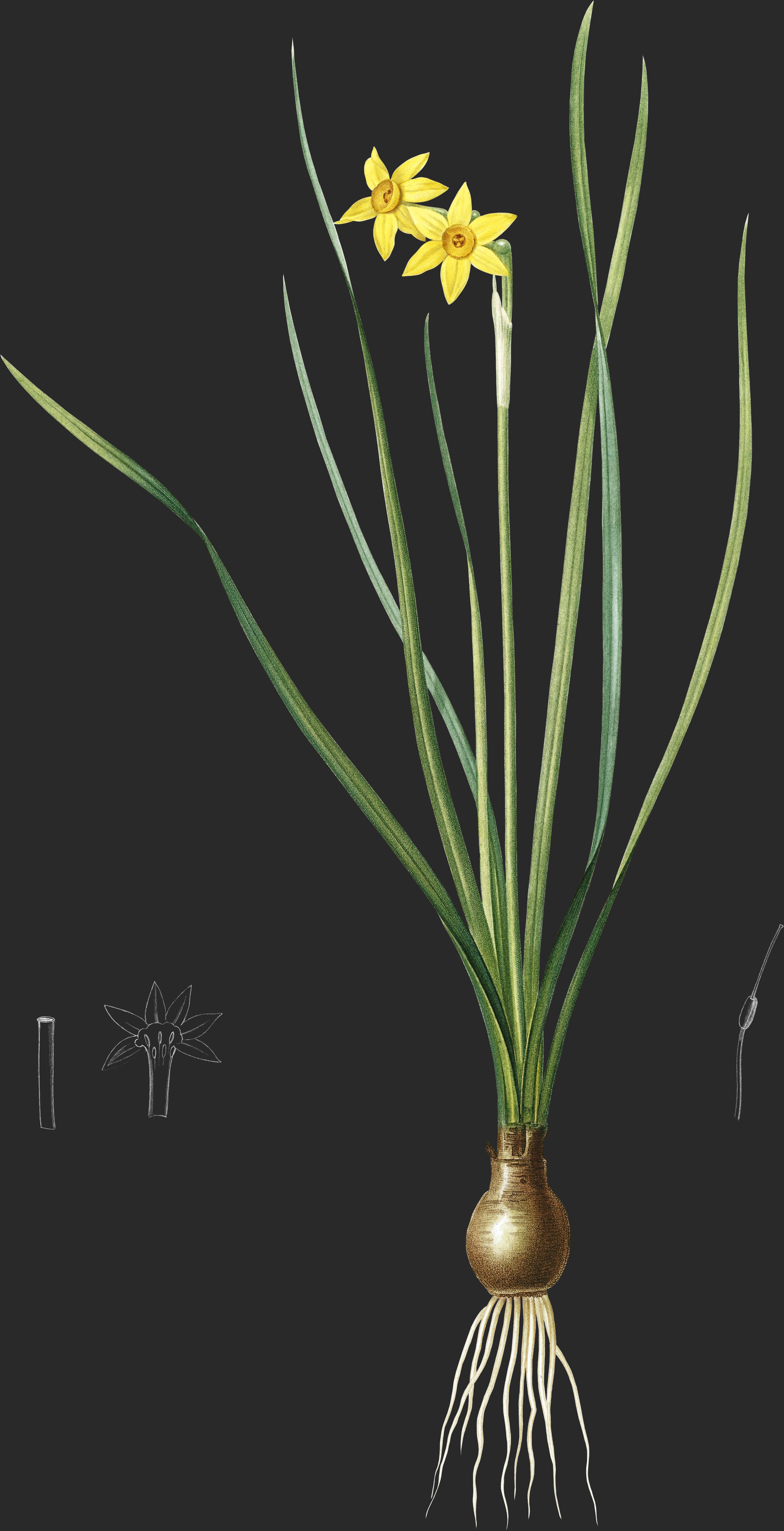 Ce Narcisse, dont nous ne connaissons point l’origine, a fleuri, au mois d’avril, dans la serre ou orangerie du Jardio des Plantes. Il produit plus de feuilles, et est beaucoup plas petit que le Narcisses intermedius; comme ce dernier Narcisse, il produit plusieurs fleurs sur la hampe, mais dont le limbe à divisions aiguës, en étoile, est fort différent. Notre Narcisses radiatus est voisin du Nar. cisses pumiles, par la disposition des feuilles et par celle des étamines.