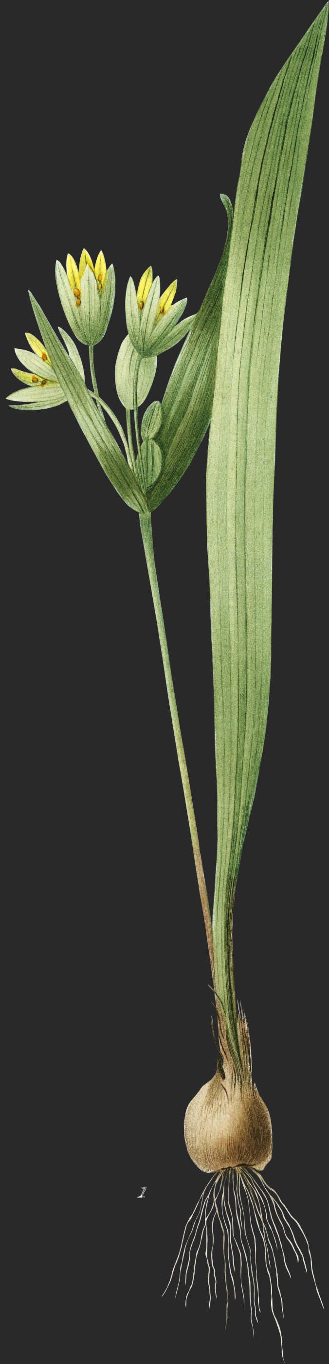 Une bulbe ovale, grosse comme une noisette, couverte de tuniques grises un peu coriaces, donne naissance par sa base à des fibres radicales, courtes, tres-fines et très-nombreuses. Un peu au-dessous de son sommet, sortent, par une ouverture commune, une hampe et une feuille solitaire. Celle-ci est droite, linéaire-lancéolée, haute de deux à trois décimètres, large de dix à quinze mil-limètres, courbée en gouttière, surtout dans sa partie inférieure qui embrasse la hampe, glabre, entière, aiguë, et renflée à son sommet en manière de capu-chon. La hampe est droite, simple, anguleuse, glabre, plas grosse dans le haut que dans le bas. De son sommet naissent deux feuilles ou bractées opposées, lancéolées, aigués, ciliées, inégales. La plas grande atteint souvent la longueur d’un décimètre. Il y en a quelquefois une troisième plas petite que les deux autres. Les fleurs, au nombre de trois à sept, forment au milieu de l’espèce de collerette qui résulte de la réunion de ces feuilles une ombelle terminale à rayons inégaux. Leurs pédicelles sont glabres, simples, un peu triangulaires, longs de un à quatre centimètres.