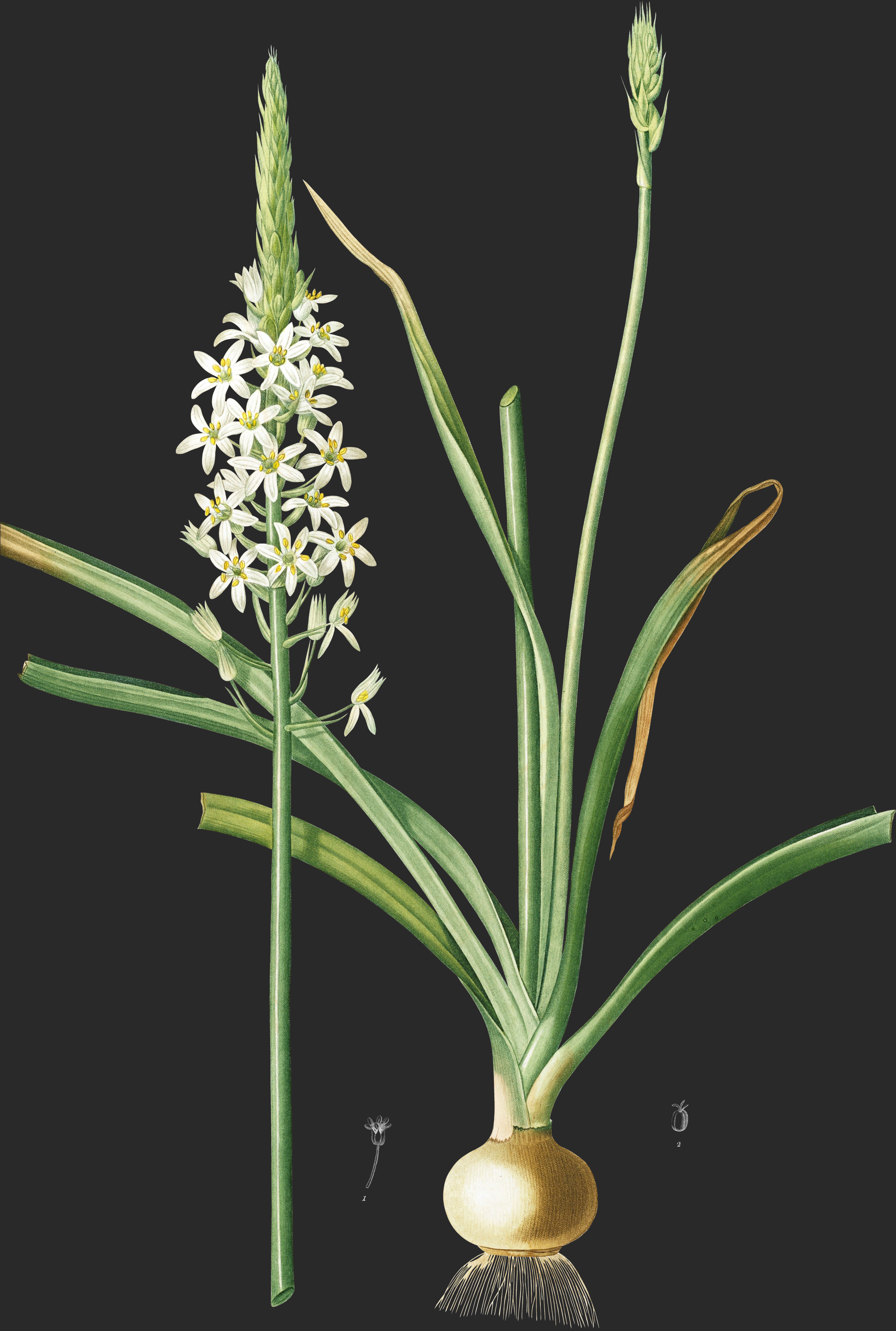 Une bulbe arrondie, légèrement déprimée, grosse comme un abricot, couverte de tuniques, d’un gris pale, émet en dessous des fibres radicales, déliées. courtes et nombreuses. De son sommet sortent des feuilles linéaires, aigues, pliées en gouttière, glabres, entières, molles, couchées sur la terre, longues de trois à cinq décimètres, larges de deux ou trois centimètres. Ces feuilles commencent deja à se faner à l’époque de la floraison.