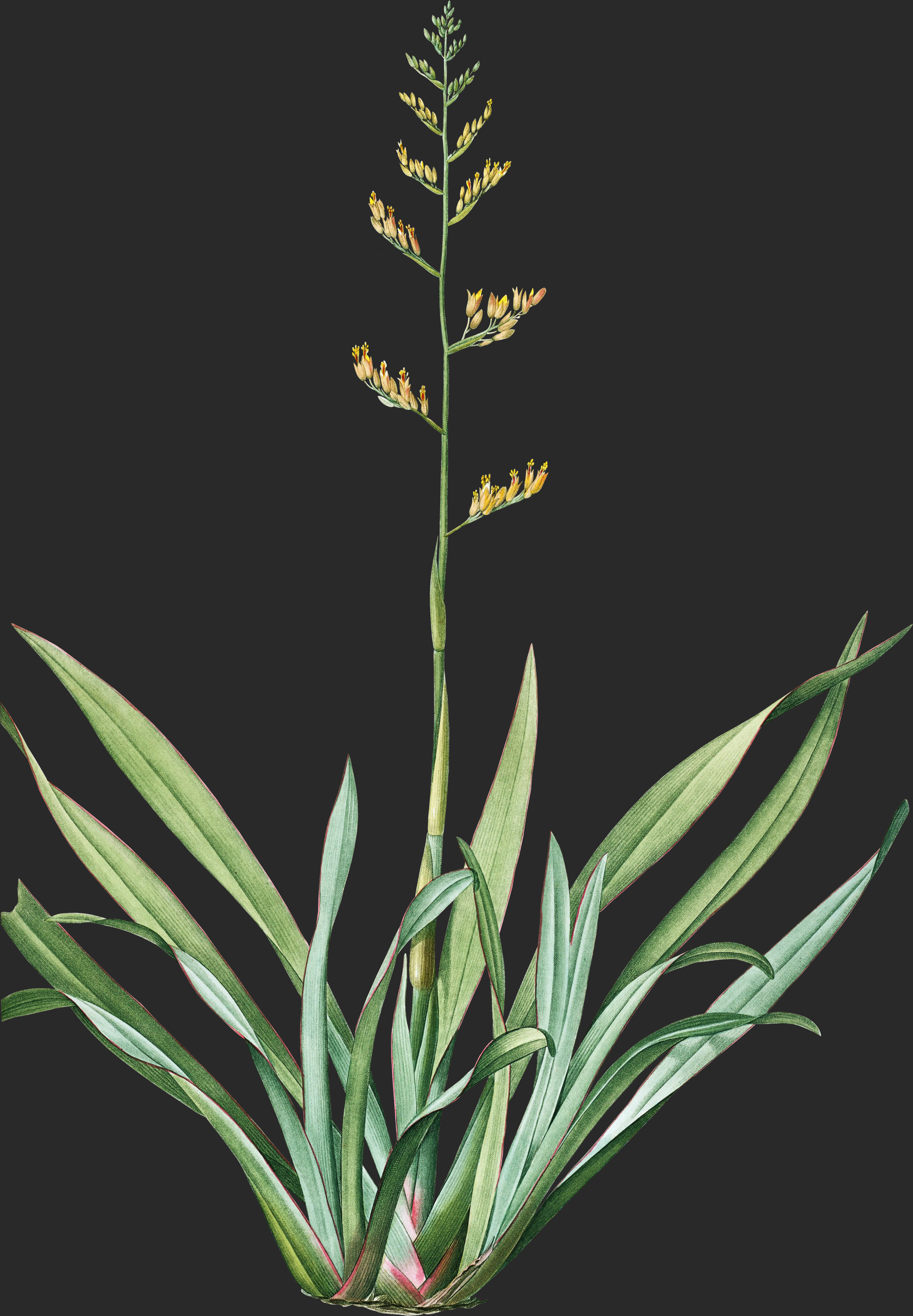 Les feuilles sont radicales, distiques, et forment des faisceaux comprimés, étalés en éventail comme dans les Iris; elles sont longues de dix à seize décimètres (trois à cinq pieds), coriaces, très-résistantes si l’on cherche à les rompre en travers; faciles à séparer, dans le sens de leur longueur, en fibres fortes et liantes. La lame de chaque feuille nait obliquement d’une gaine comprimée, tranchante sur le dos, et sur le plan de laquelle la lame se croise. Cette lame est lancéolée, aigue, en gouttière en dessus, principalement vers la gaine; elle est lisse et très-finement striée; ses bords sont cartilagineux et d’une couleur rouge-oran-gée; sa face dorsale est glauque, striée et réparée lougitudinalement en deux portions latérales par une nervure moyenne, saillante et colorée.