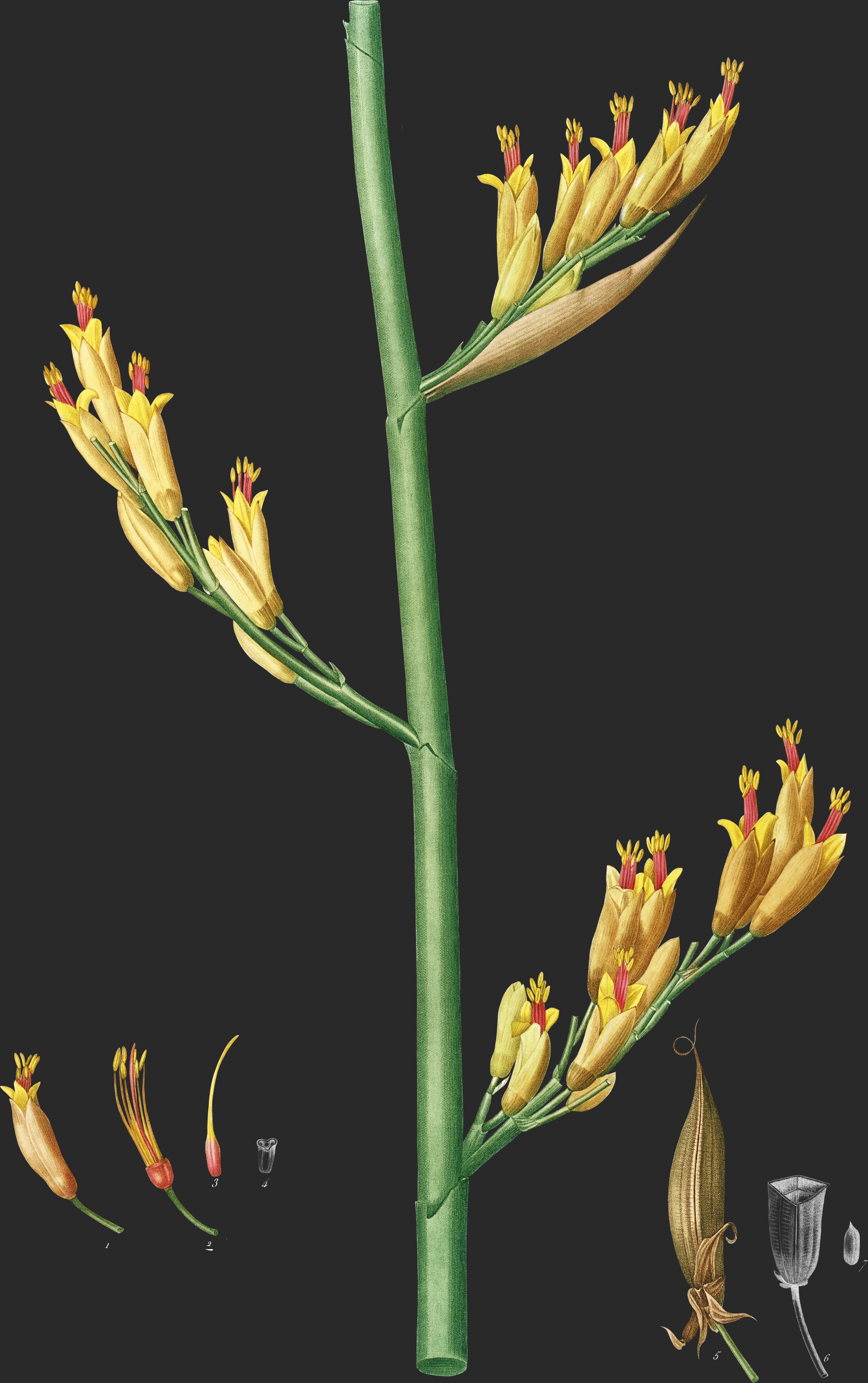 Les étamines, au nombre de six, dépassent le périgone. Leurs filets sont cylindriques, colorés au sommet; ils s’insèrent à la base des divisions du périgone sur le contour intérieur qui unit ces divisions, et qui se confond avec une portion sterile et adnee de la base de Tovaire. Trois des filaments sont alternativement plus courts. Les anthères sont droites, terminales, sagittées, à deux loges dont le pollen est d’abord rouge et devient jaune. Le pistil est de la longueur des plus grandes étamines. L’ovaire est triquètre, aigu, oblong, à angles mousses canelés. Sa base est soudée et enfoncée dans la base commune des divisions du périgone. Le style est triquètre, subulé et se termine par un stigmate un peu évasé en trompe. L’ovaire devient une capsule supère, mais engagée, par une portion mince de sa base, dans la base entière du périgone avec laquelle l’ovaire était adné. Cette capsule est triquètre, un peu torse, longue de huit centimètres (trois pouces), formée de trois valves, et à trois loges. Les valves sont coriaces, très-brunes en dehors; elles s’ouvrent par les angles de la capsule. Une cloison longitudinale nait du milieu des valves. Les graines sont noires, un peu ridées, brillantes, oblongues, comprimées, membraneuses sur les bords, insérées alternativement de l’un et de l’autre côté de la cloison de chaque valve sur le bord qui unit les cloisons.