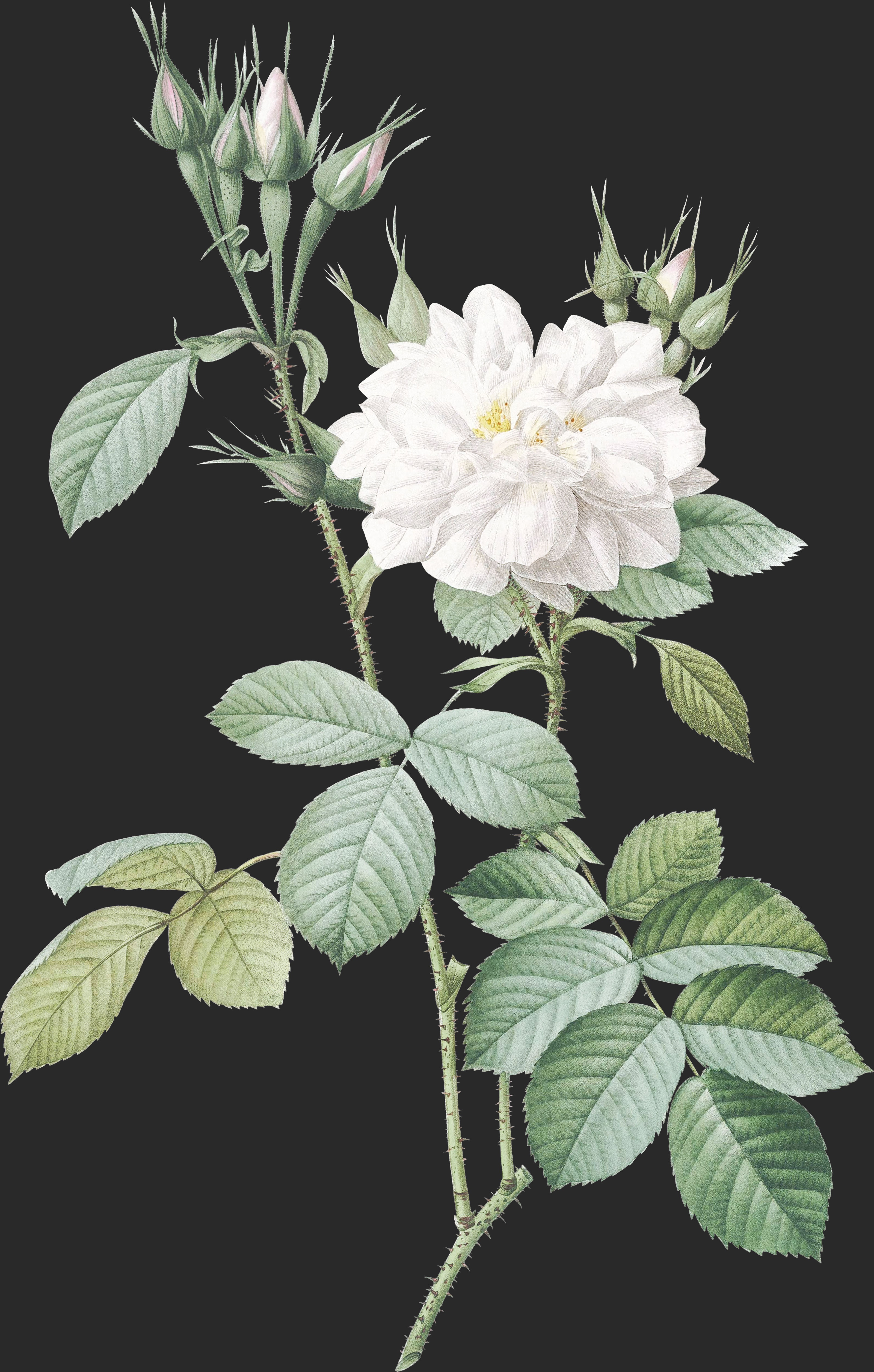 Cet arbuste, qui a été rare pendant long-temps, est aujourd’hui répandu dans presque tous les jardins. Il est un peu moins vigoureux que le Rosier des Quatre Saisons des Par fumeurs; ses tiges sont divisées en rameaux diffus, presque tortueux, hérissés de poils roides et glanduleux, et munis d’aiguillons, les uns droits, les autres un peu courbés. Les feuilles se composent de cinq folioles rondes ou elliptiques, à dentelure égale, d’un verd-tendre en-dessus, plus pâles et tomenteuses en-dessous et en leurs bords; elles sont portées par un pétiole hispide, muni de petits aiguillons jaunâtres, ayant à sa base des stipules longues et bifides, à bordure denticulée et velue. Les fleurs, pleines, terminales, redressées et rapprochées en une espèce de corymbe, au nombre de trois, de sept, de dix, et même plus encore, répandent au loin cette odeur suave qui est particulière à l’espèce. Lès pédoncules qui les supportent sont hispides et munis d’aiguillons. Le tube du calice, qui se confond dans le pédoncule, présente la forme d’un entonnoir. Les divisions du limbe, trois pinnatifides et deux simples, sont glanduleuses et ciliées en leurs bords. La corolle se compose de six ou de dix rangs de pétales, environ, d’un blanc presque pur; ceux du centre sont roulés, chiffonnés, et recouvrent ce qui reste des étamines. Les fruits que donnent les fleurs, qui ne sont pas devenues stériles par l’entière transformation des organes de la fructification en pétales, offrent la figure d’un œuf très-allongé.