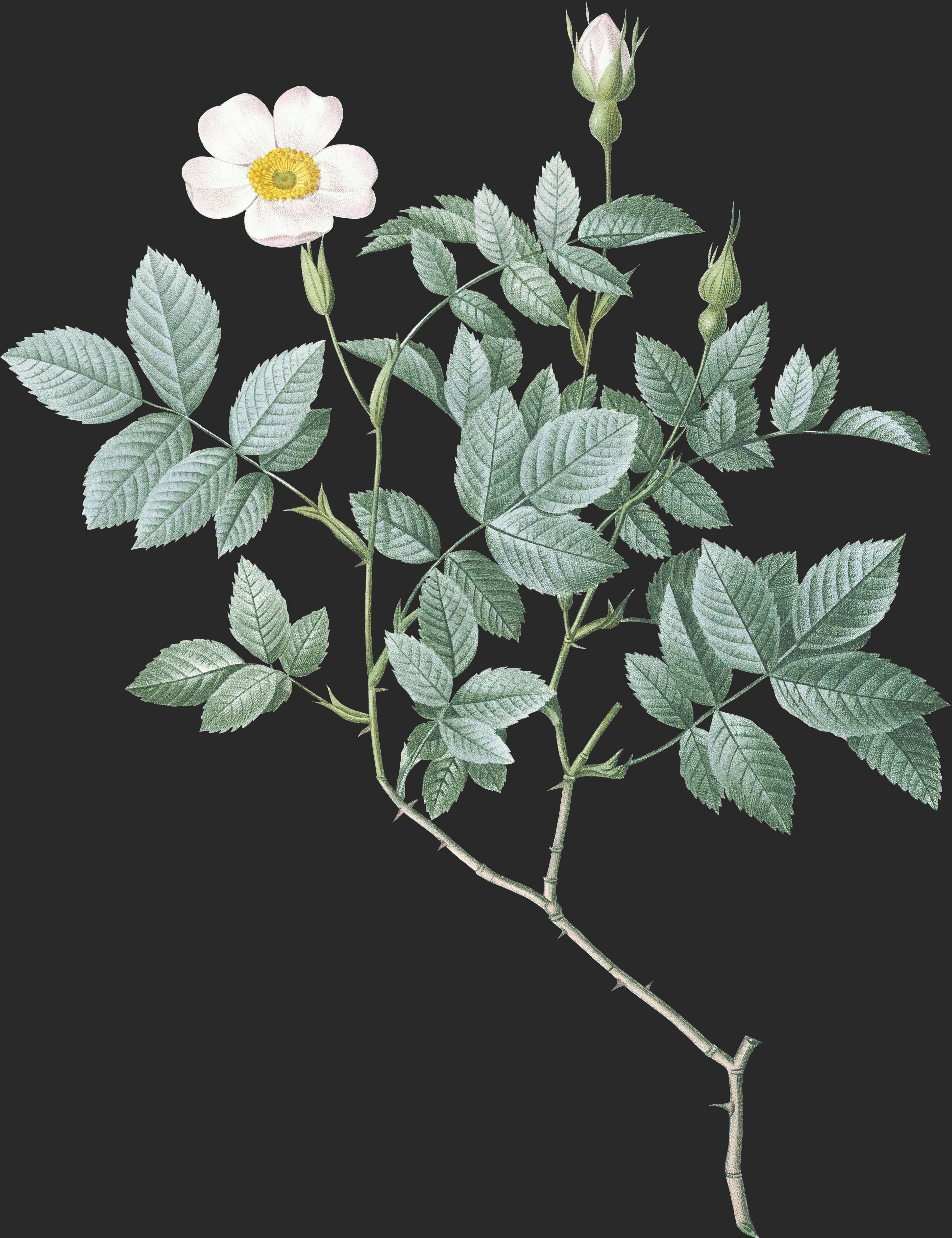 R. calycis tubo oviformi, pedunculisque superne glabris; foliolis ovalibus utrinque villosis, mollissimis, duplicato-serratis; petiolis tomentosis cauleque aculeatis; aculeis rectiusculis. Rau En. Ros. p. 147. Red. Roses, vol. 2, p. 40. Thy. Prod. groupe XI, Spec. 21.