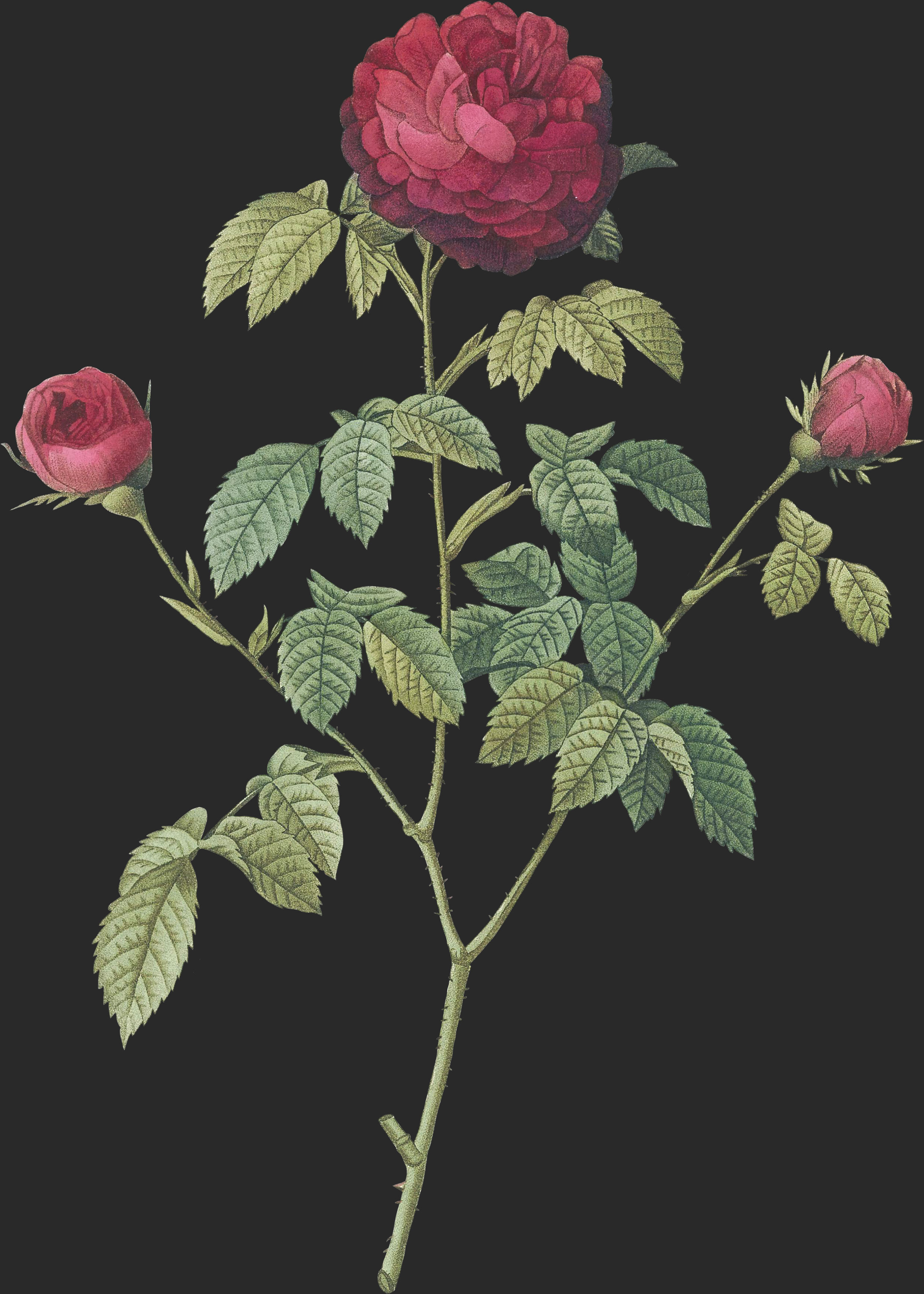 C’est une variété du Rosier de Provins, ou de France, qui entre dans la série de celles qu’on nomme Rosiers Agathes, dont la fleur est très-double, à pétales serrés, roulés et chiffonnés au centre.
