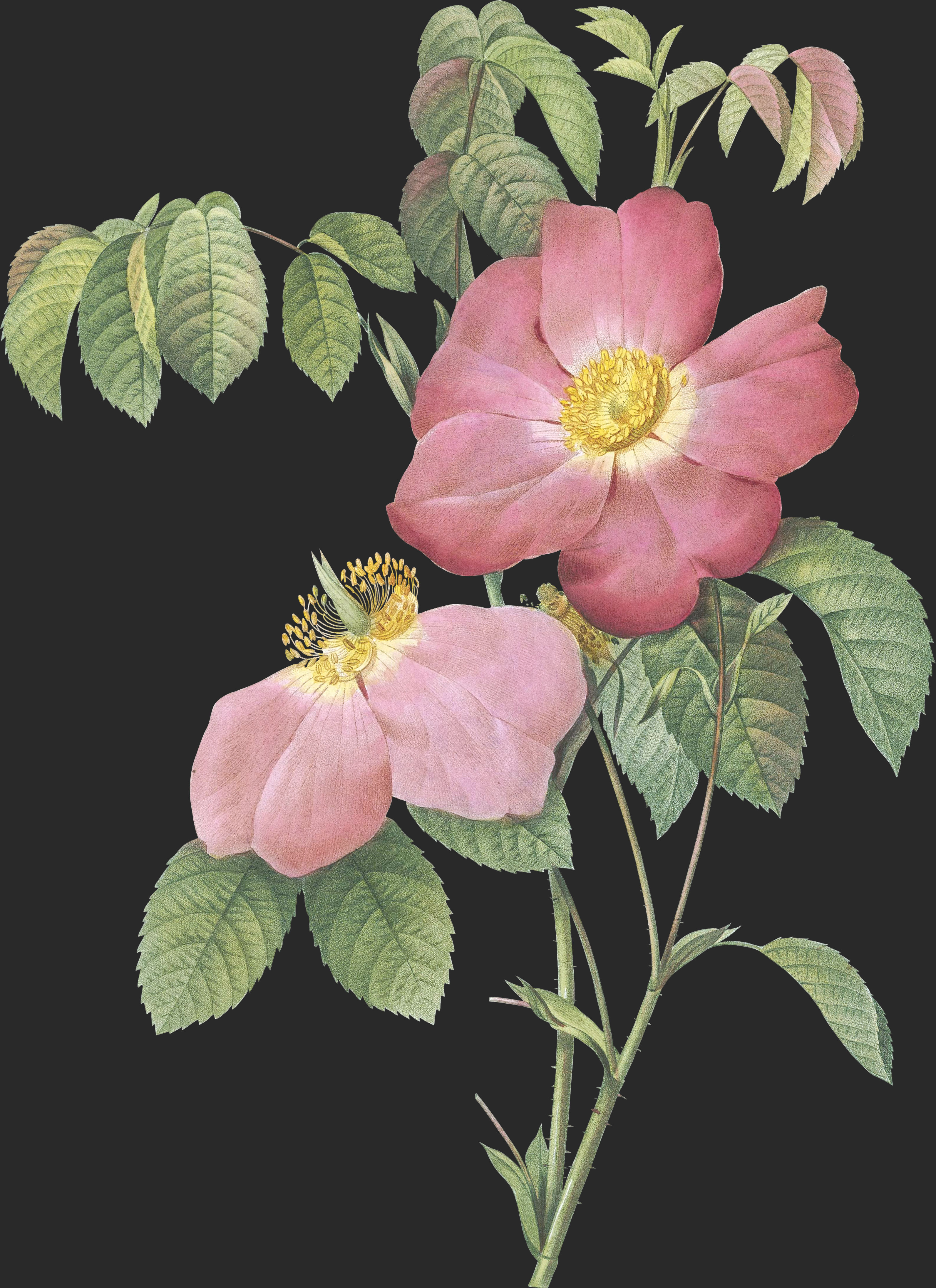 C’est un Rosier qui s’élève à deux ou trois pieds: ses rameaux, diffus, sont armés de plusieurs petits aiguillons inégaux, minces, peu dilatés à leur base. Les feuilles se composent de cinq folioles, assez grandes, en général arrondies à la base et au sommet, vertes en dessus, plus pâles et tomenteuses en-dessous, munies en leur bord de poils courts, entremêlés de glandes. Le pétiole qui les supporte, hispide-glanduleux, garni, mais rarement, de petits aiguillons, est muni à sa base de stipules grandes, bifides et pointues au sommet, denticulées et glanduleuses en leur bord. Les fleurs, tantôt solitaires, tantôt disposées par trois, naissent à l’extrémité des ramuscules qui croissent le long des branches principales: elles sont placées sur de longs pédoncules, garnis d’un grand nombre de poils spinuliformes et glanduleux. Le tube du calice est presque rond et glabre. Les divisions du limbe sont pinnatifides, et les pinnules spatulées au sommet. Corolle de cinq pétales d’un diamêtre de plus de trois pouces et demi, d’une belle couleur rose, échancrés en cœur au som-met. Fruit globuleux et rouge à la maturité.