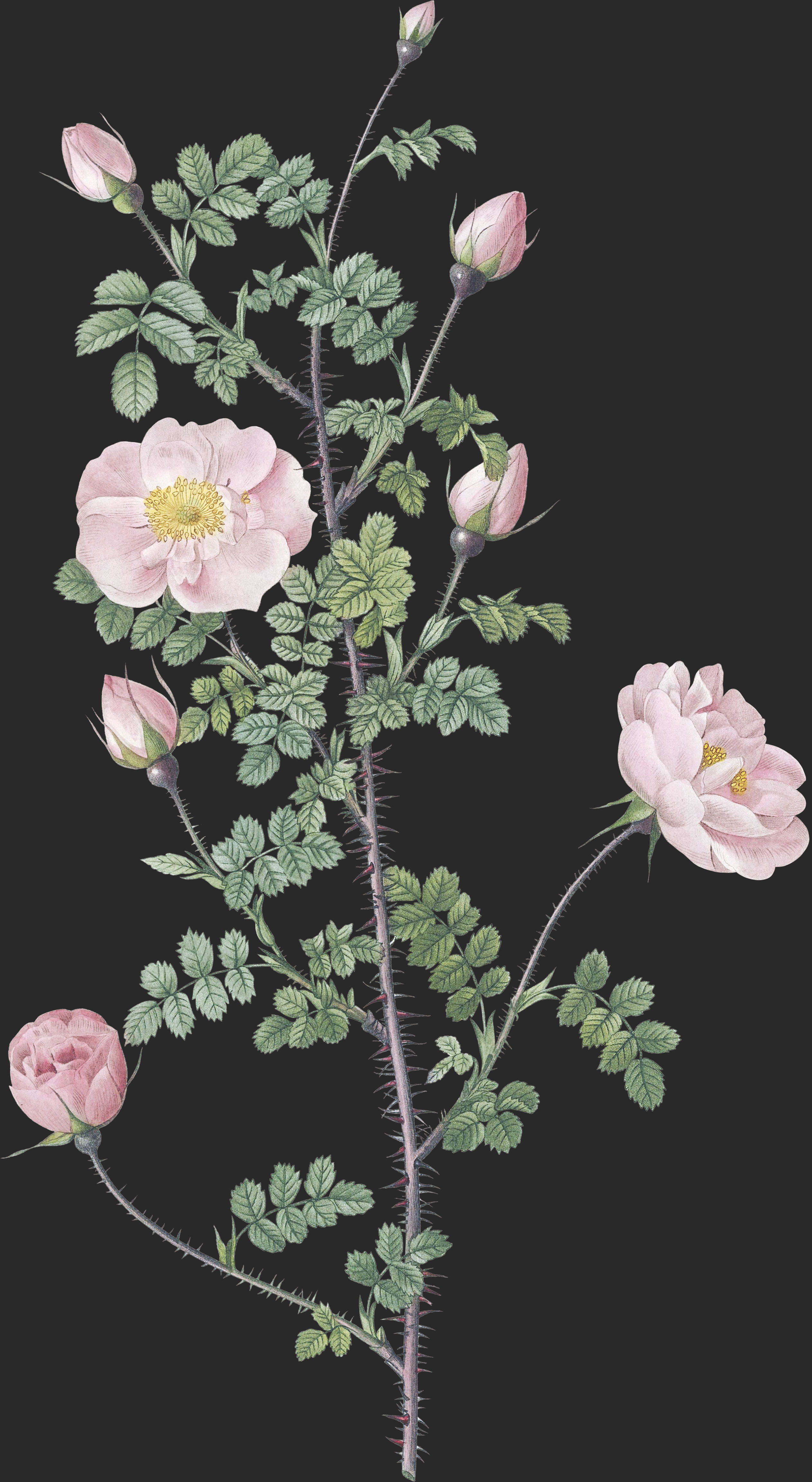 Cette rare et belle variété s’élève en un buisson touffu à la hauteur d’un pied et demi, ou environ. Ses rameaux diver-gents, sont munis d’aiguillons inégaux, courts et presque droits. Les feuilles se composent de cing, de sept et souvent de neuf folioles rondes ou elliptiques, simplement dentées. Elles sont supportées par un pétiole glabre, ordinairement dépourvu d’aiguillons, ayant à sa base des stipules étroites et aigues. Les fleurs, d’un rose-tendre, légèrement odorantes, sont solitaires à l’extrémité des petits rameaux qui croissent le long des rameaux principaux: elles sont portées par des pédoncules glabres ou hispides, et souvent le même pied présente l’un et l’autre accident. D’ailleurs, cet arbuste ne diffère du Rosier Pimprenelle commun, à fleurs rouges et simples, que par sa corolle plus ou moins double, composée tantôt de cinq, tantôt de six à sept rangs de pétales, et encore par ses tiges beaucoup moins élevées. Les fruits, de la grosseur d’une pétite merise, sont d’abord rouges; mais ils noircissent à la maturité.