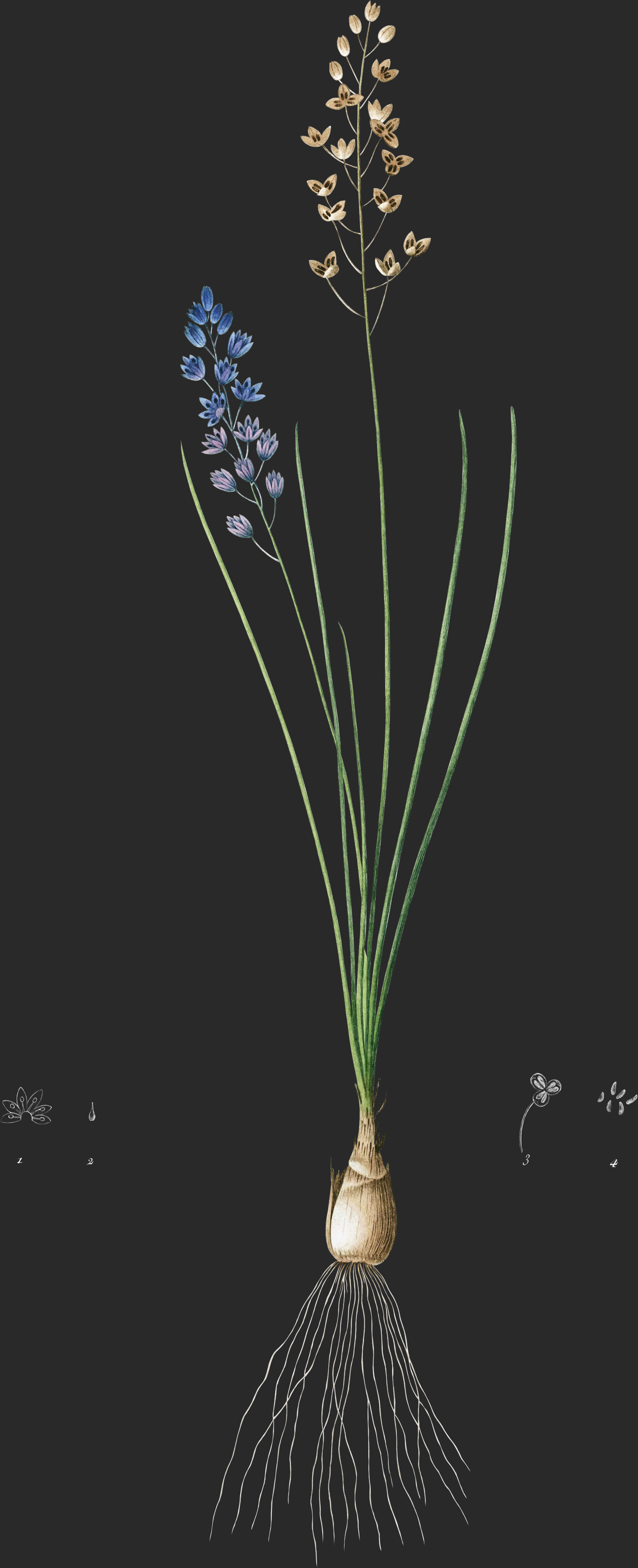 Une bulbe arrondie, grosse comme une petite noix et couverte de tuniques grises, émet par sa base des fibres radicales courtes et nombreuses. De son sommet sortent deux ou trois hampes nues, cylindriques, grêles, droites, hautes de deux centimètres environ, et cinq ou six feuilles linéaires, étroites, presque filiformes, aigués, un peu roides et charnues, creusées d’une gouttière sur leur bord supérieur, de moitié plus courtes que les hampes.