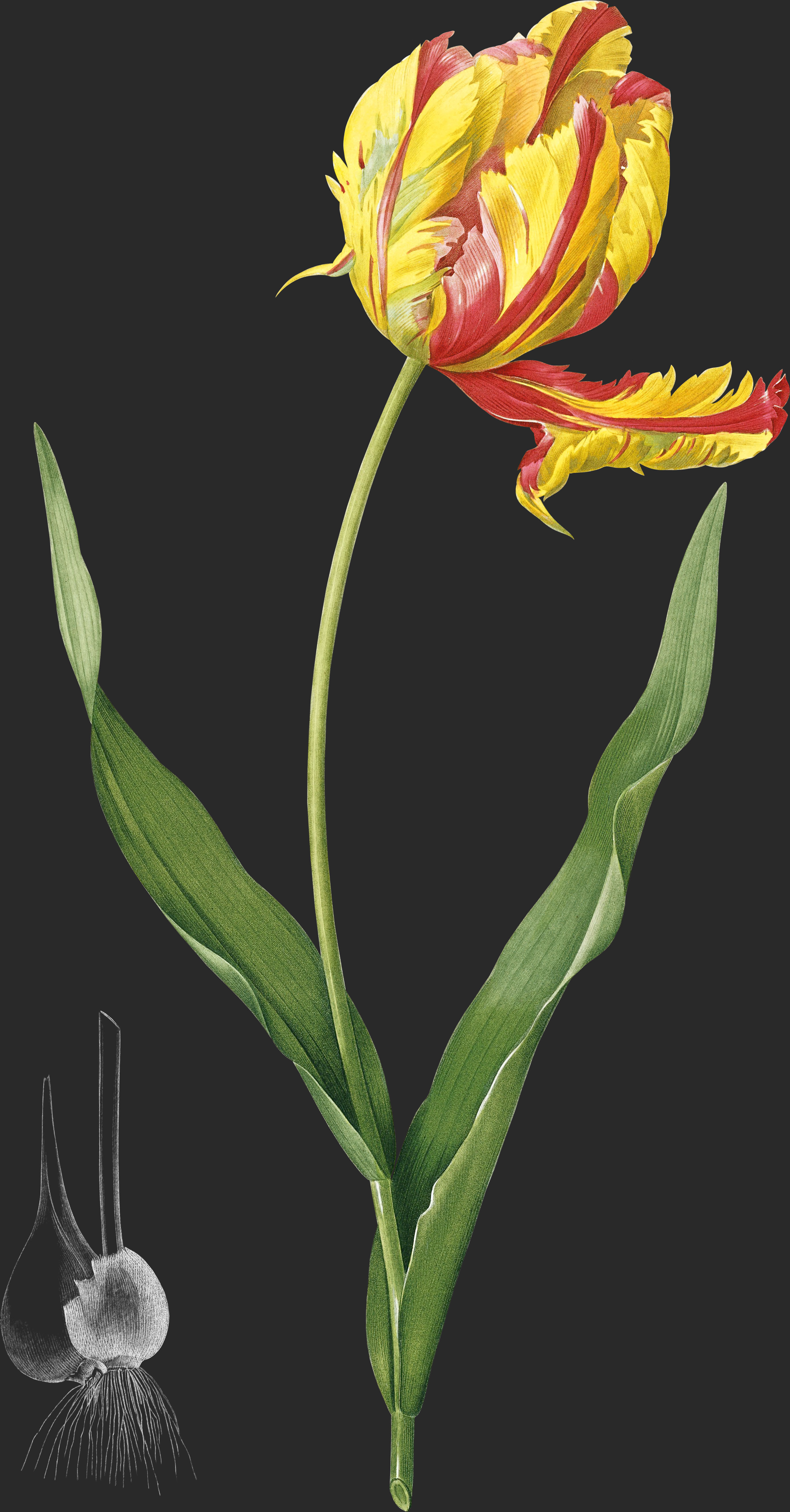 Cette variété de la Tulipe des jardins paraît avoir été obtenue, comme la pré-cédente, de la jaune simple; elle est plus nouvelle, et nous ne découvrons point qu’il en soit fait mention dans le Catalogue ou Pinas donné par Gaspard Bauhin en 1623.