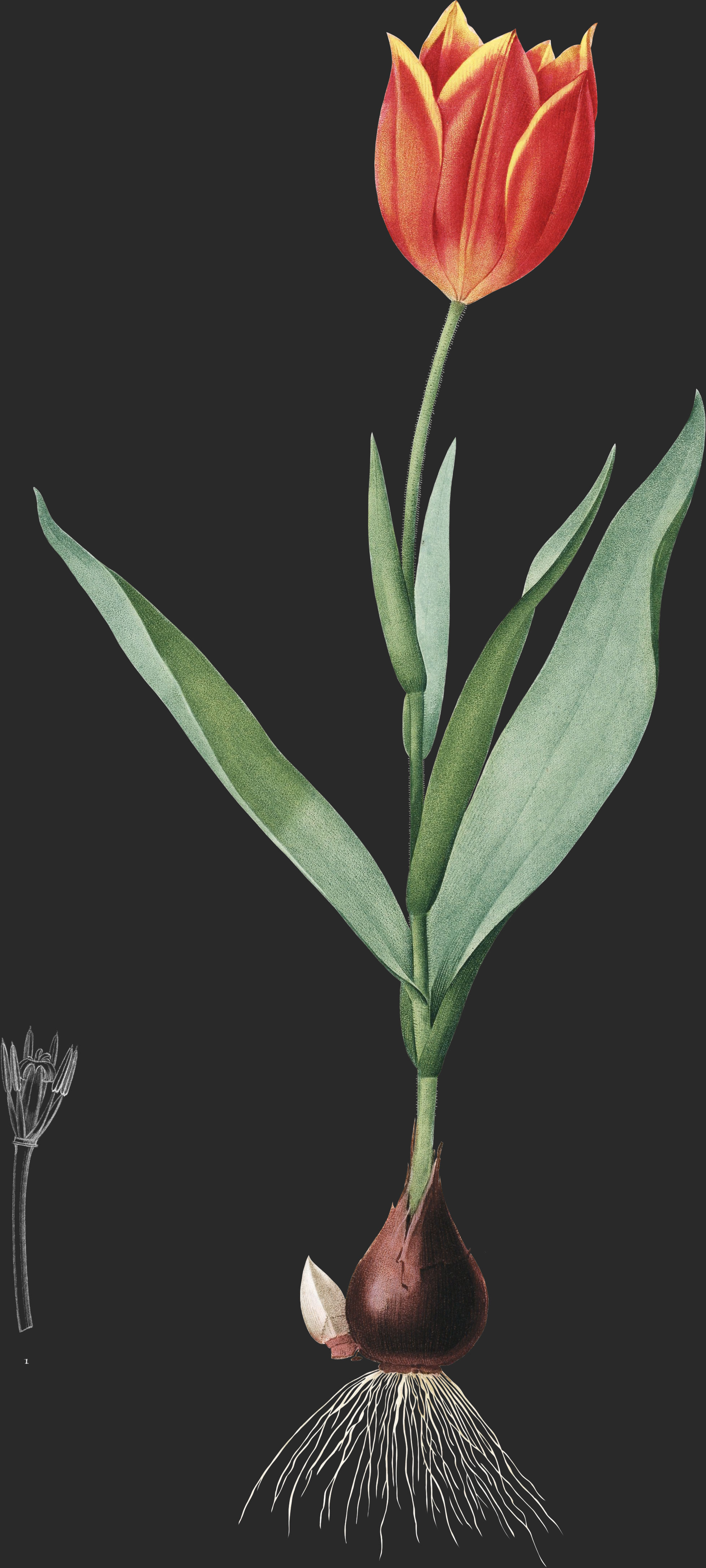 Sa bulbe, qui est ovoïde, et un peu plas petite que celle de la Tulipe de Gessner, donne naissance une tige droite, cylindrique, simple, qui dépasse à peine la longueur des feuilles, et dont la hauteur est ordinairement de 5–6 cen-timètres; l’individu, d’après lequel la planche ci-jointe a été dessinée, était monstrueux par sa grandeur: cette tige est d’un vert grisitre, toute couverte de poils courts et serrés; ces mêmes poils se retrouvent sur les feuilles, et, ce qui est remarquable, à leur surface supérieure seulement.