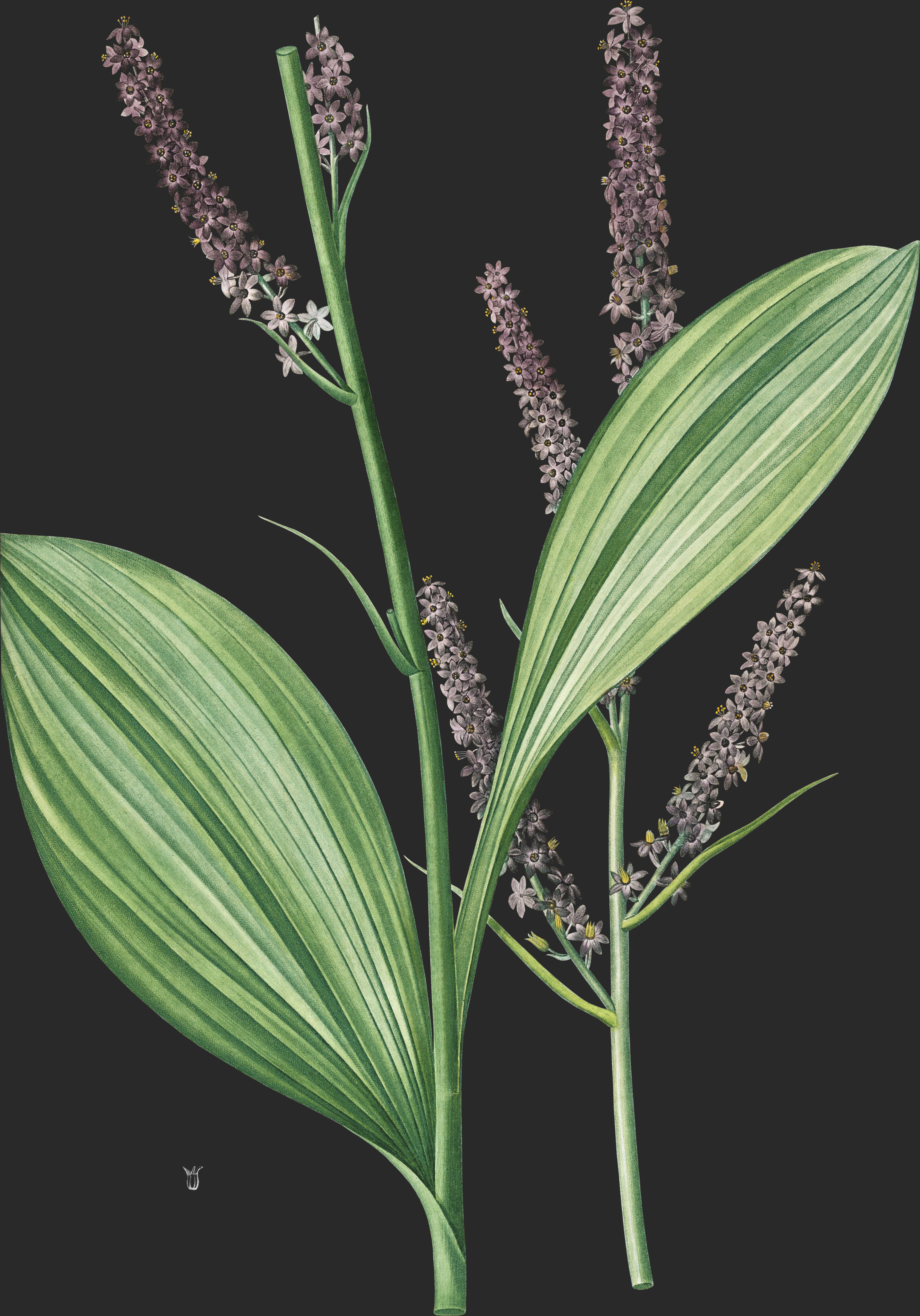 Les étamines sont insérées à la base des divisions du périgone, auxquelles elles ressemblent pour la couleur. Leurs filaments sont en forme de soies, arqués avec la concavité tournée en dehors. Les anthères sont petites, rondes, noires, un peu en forme de bouclier. Leurs deux loges s’ouvrent en dehors.