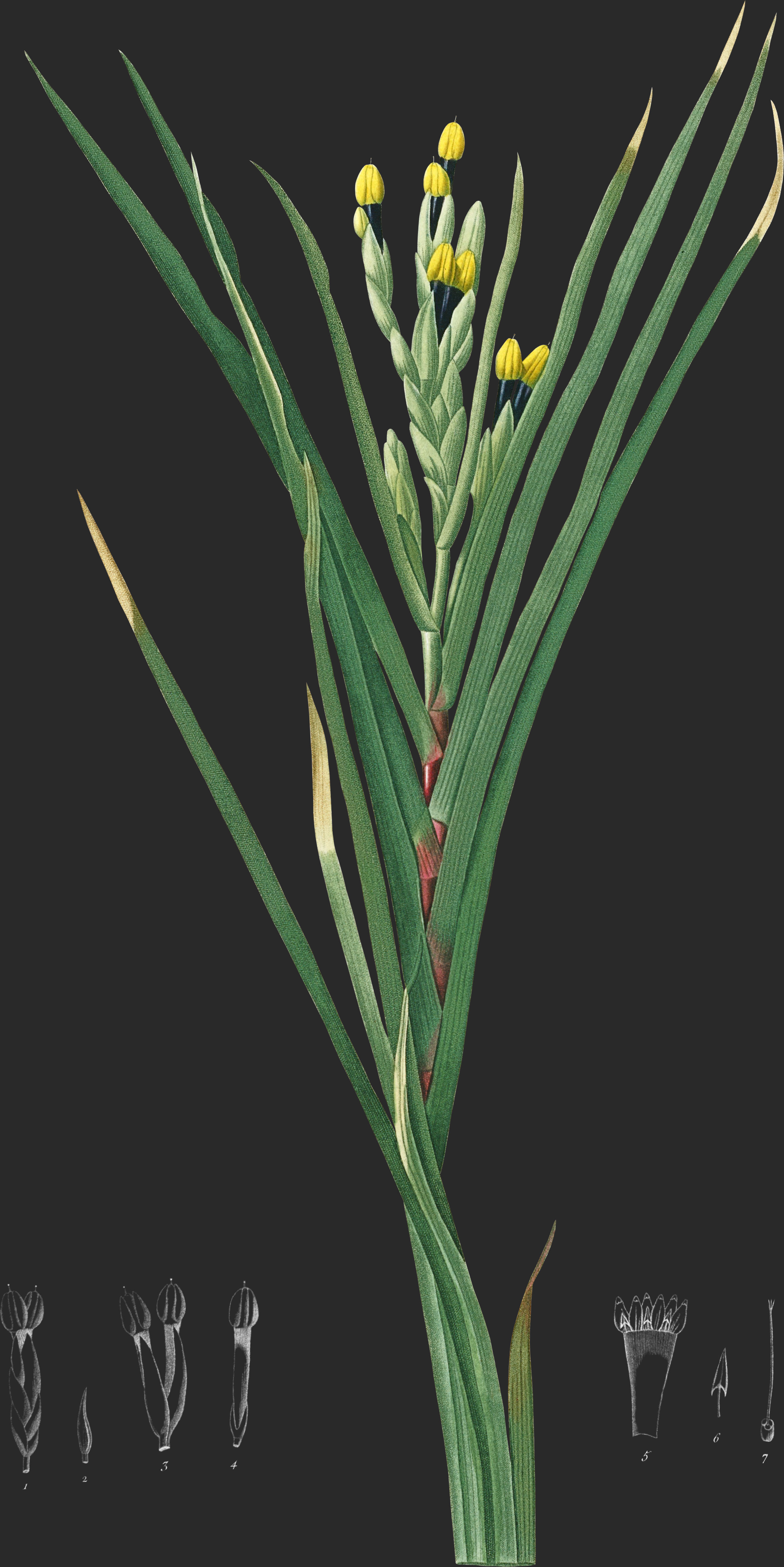La tige de cette plante est fratescente, comme articulée à deux tranchants; sa base est environnée de plusieurs rameaux rts, du milieu desquels la tige élancée sort pour produire les fleurs. Les feuilles sont linéaires lancéolées, distiques, en éventail, à gaine comprimée, tranchante sur le dos. Ces feuilles varient un peu rétrécies immédiatement au-dessus de la gaine, s’élargissent en lame de coutean par le bord intérieur.
